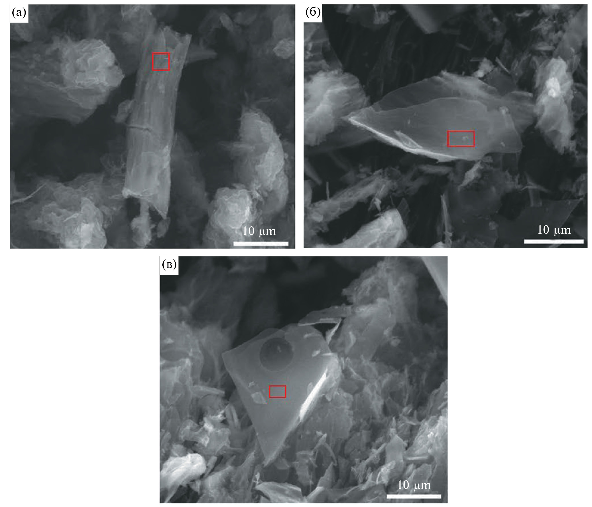 Рис. 1. Электронные изображения образцов МГ, синтезированных из целлюлозы (a), коры сосновой (б), лигнина технического (в). Увеличение ×5000. Красными квадратами показаны области для измерения элементного состава энерго-дисперсионным методом.