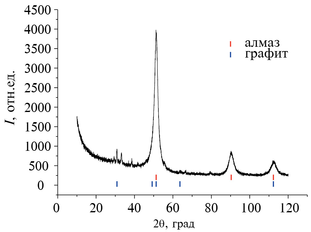 Согласно данным спектроскопии комбинационного рассеяния (рис. 2) и рентгенофазового анализа (рис. П1 Приложения), помимо фазы алмаза в исследуемом порошке содержится углерод в состоянии sp2-гибридизации, соответствующей фазе графита. Как видно из рис. 2, помимо пика 1328 см–1, характерного для наноалмаза, в спектре присутствует также широкий асимметричный пик с максимумом при 1630 см–1. Согласно [51], этот пик главным образом является суперпозицией G-линии углерода в sp2-состоянии, характерной для спектра КР образцов, содержащих фазу графита [52], и пиком, соответствующим деформационным ОН колебаниям адсорбированной на поверхности частиц воды или поверхностных функциональных ОН-групп.