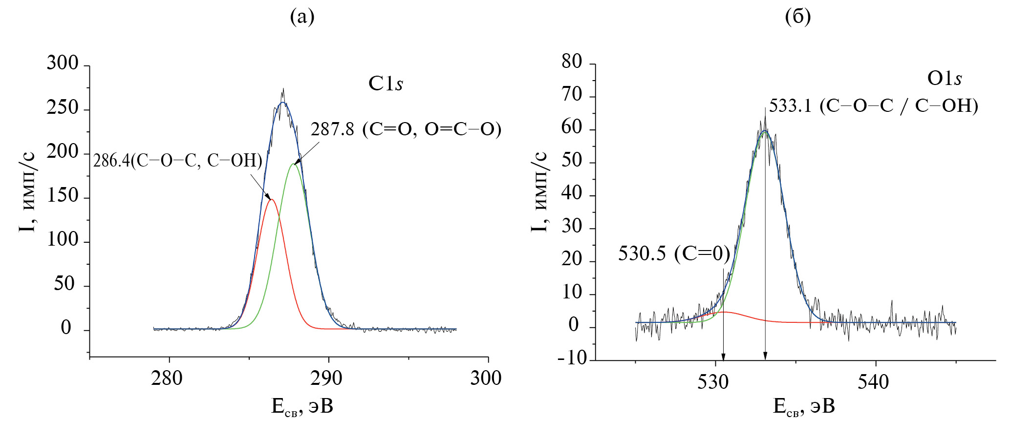 Результаты деконволюции пиков C1s и O1s рентгенофотоэлектронного спектра порошка ДНА приведены на рис. 3а и 3б соответственно. Как видно из рис. 3а, пик с энергией связи 286.4 эВ соответствует атомам углерода в составе гидроксильных и эфирных групп [53–57]. Энергия связи 287.8 эВ отвечает за состояние атомов углерода в карбонильной [56, 57] или карбоксильной группе [53, 54]. Разложение O1s спектра (рис. 3б) показывает наличие в нем пиков с максимумами при 533.1 эВ – основной пик, соответствующий связи между атомами углерода и кислорода в С–О–С и С–О–Н группах, а также пик малой интенсивности c максимумом 530.5 эВ, который, по всей видимости, может соответствовать энергии связи С=О в карбонильной группе [55–58].