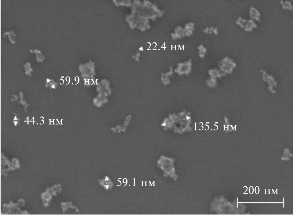 Морфология и дисперсность частиц исходного гидрозоля были изучены методом сканирующей электронной микроскопии (СЭМ) с использованием сканирующего электронного микроскопа Carl Zeiss Merlin (Carl Zeiss Merlin, Германия) в Междисциплинарном ресурсном центре по направлению “Нанотехнологии” Научного парка СПбГУ.