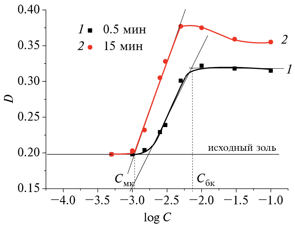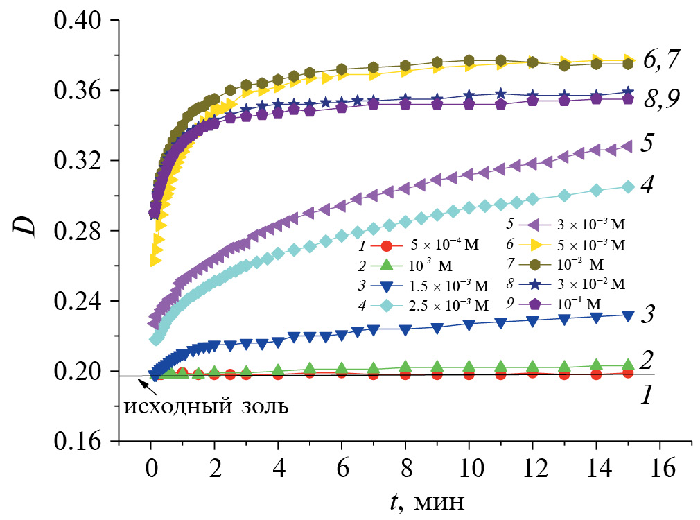 На рис. 7 представлены результаты изучения кинетики коагуляции водного золя ДНА при естественном значении рН (5.8–6.0) и различных концентрациях растворов хлорида натрия. Из рис. 7 видно, что исследуемый золь ДНА агрегативно устойчив при СNaCl ≤ 10–3 М, о чем свидетельствует постоянство оптической плотности в течение 15 мин наблюдения. При СNaCl ≥ 10–2 М ход зависимостей D – t характерен для протекания быстрой коагуляции (БК). В промежуточной области концентраций протекает медленная коагуляция (МК), скорость которой растет по мере увеличения концентрации растворов NaCl. Более точные значения порогов коагуляции были определены графически из концентрационных зависимостей оптической плотности золей, измеренной через 0.5 и 15 мин после добавления NaCl (рис. 8) [31]. Найденные таким образом значения порогов медленной Cмк и быстрой Сбк коагуляции золя ДНА составили 1.1 × 10–3 М и 7.4 × 10–3 М соответственно. Следует отметить достаточно узкую область медленной коагуляции золя и тот факт, что полученные значения Сб.к заметно ниже, чем для типичных ионно-стабилизированных коллоидов (~(1–3) × 10–1 М). Вероятно, это может быть связано с относительно высоким значением константы Гамакера частиц детонационного алмаза. Также обращает на себя внимание тот факт, что в отличие от полидисперсных золей оксидов (например, оксида циркония [31]), для которых достаточно характерно наличие областей слабой и интенсивной медленной коагуляции, зона слабой МК, в которой ожидается преимущественное протекание коагуляции первичных наночастиц, для золя ДНА не характерна. Вероятно, это может свидетельствовать о том, что первичных наночастиц ДНА в исследуемом золе практически не содержится.