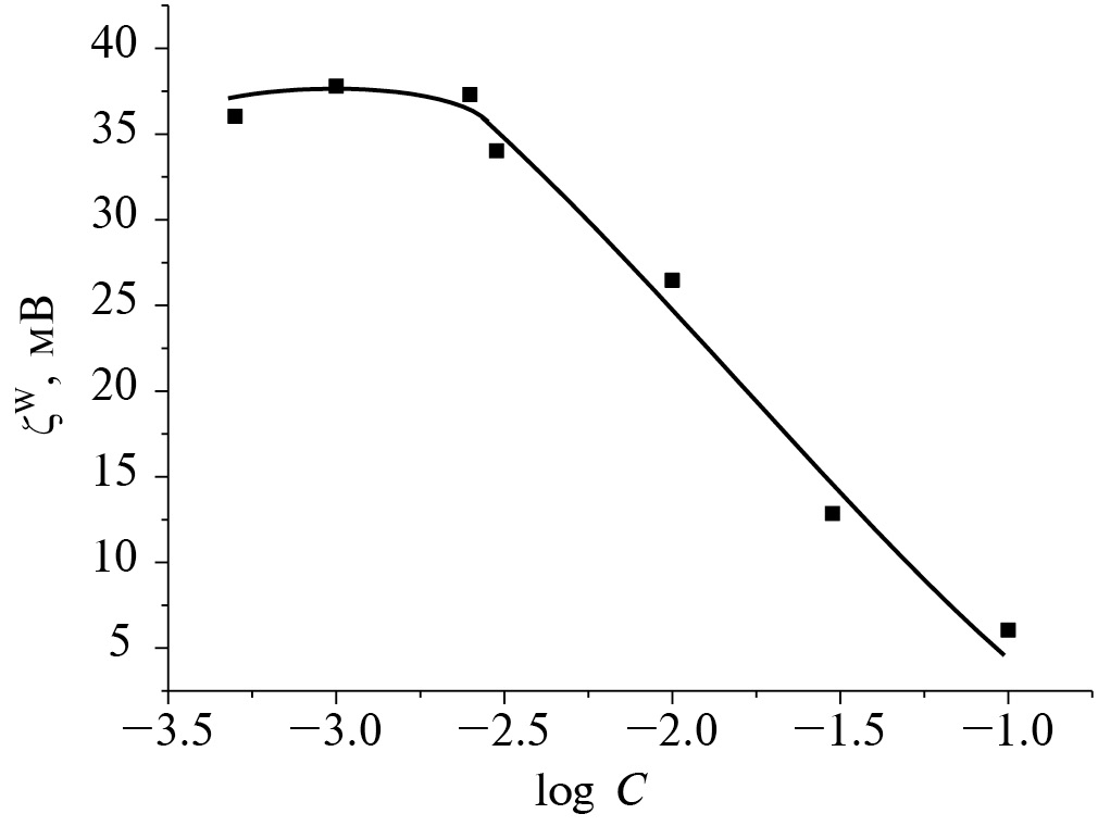 Рис. 9. Зависимость дзета-потенциала (ζW) частиц ДНА от концентрации растворов хлорида натрия при естественном значении рН.