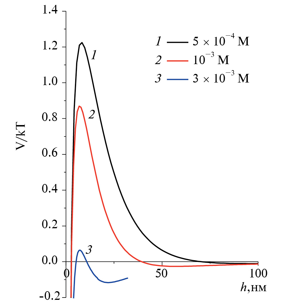 Для выяснения характера наблюдаемой устойчивости и коагуляции водного золя ДНА были проведены расчеты энергии парного взаимодействия частиц (V) по классической [33–35] (формула (2)) и обобщенной теории ДЛФО [36–38] (формула (3)).