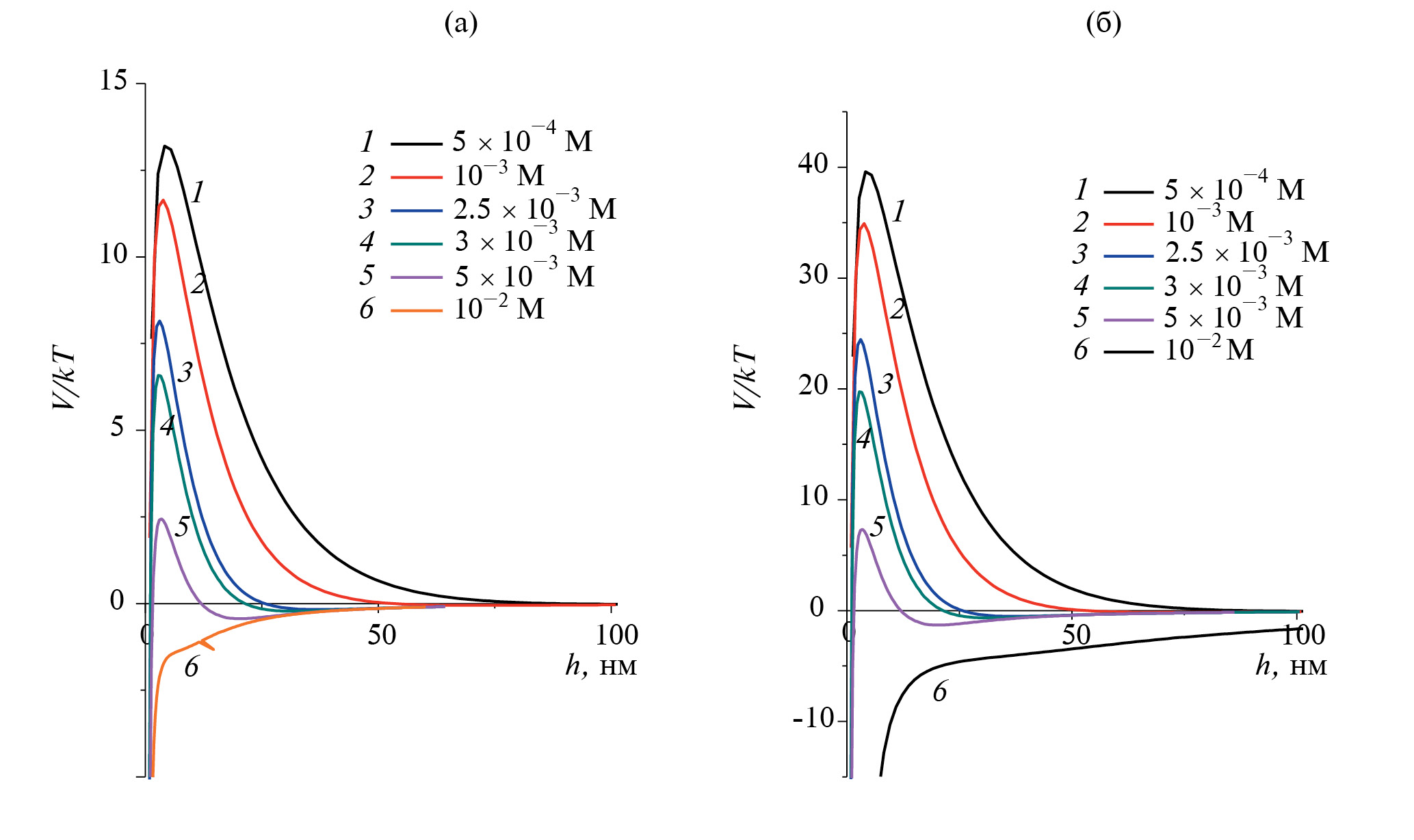 Рис. 11. Зависимости энергии парного взаимодействия агрегатов ДНА (45 нм (а) и 135 нм (б)) от расстояния при естественном значении рН и различных концентрациях растворов хлорида натрия. Расчет по расширенной теории ДЛФО. Аэфф = 0.58 × 10–19 Дж, K = 1 × 106 Дж/м3; l = 1.0 нм.