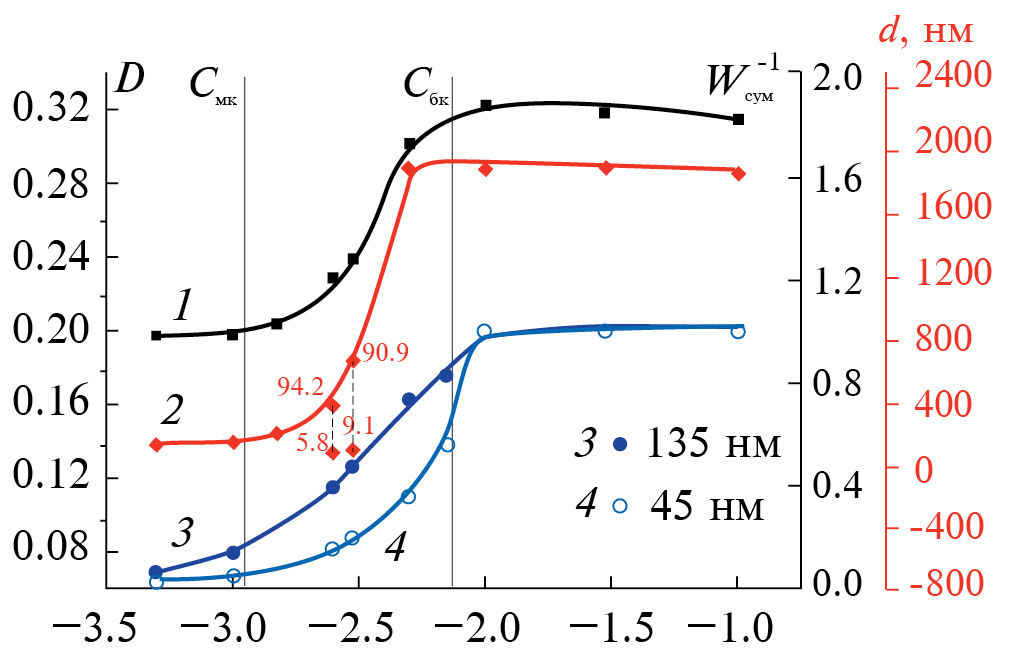 Из зависимостей энергии парного взаимодействия частиц от расстояния между ними при разных концентрациях электролита (рис. 11) следует, что порогу быстрой коагуляции соответствует интервал концентраций NaCl, соответствующий исчезновению небольшого барьера отталкивания и переходу к области притяжения частиц на всех расстояниях между ними. Из данных рис. 12 следует очевидная корреляция между экспериментальными концентрационными зависимостями оптической плотности (t = 0.5 мин) и среднего размера частиц (t = 20 мин) и рассчитанными зависимостями суммарного фактора агрегации Wсум–1 от lgC для обозначенной группы параметров Аэфф и l и основных размеров первичных агрегатов в золе. Нетрудно заключить, что основным фактором стабилизации золя ДНА является электростатический. В рассмотренном интервале концентраций NaCl для основных размеров частиц коагуляция золя может протекать по барьерному, безбарьерному и смешанному механизмам. Последнее положение могут иллюстрировать, например, данные, представленные в табл. 1 и на рис. 11. При этом основной вклад в устойчивость золя вносят первичные агрегаты с меньшим размером (45 нм). Следует отметить, что в случае взаимодействия частиц промежуточных размеров результаты расчетов будут лишь количественно другими, при этом анализ парных взаимодействий частиц приведет к тому же заключению о характере коагуляции и о вполне удовлетворительном соответствии теории и эксперимента.