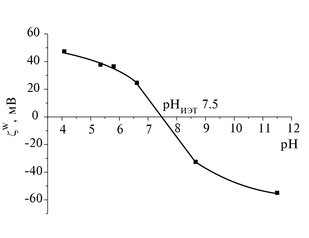 Таким образом, согласно данным РФЭС, ИК-Фурье и Рамановской спектроскопии, поверхность частиц ДНА гетерогенна, главным образом, содержит ионогенные карбоксильные и гидроксильные функциональные группы, а также неионогенные углеводородные. Наличие ионогенных амфотерных ‒СОН и кислотных ‒СООН групп на поверхности частиц ДНА, их количество и степень ионизации определяет знак и величину заряда поверхности частиц наноалмаза в жидкой дисперсионной среде: