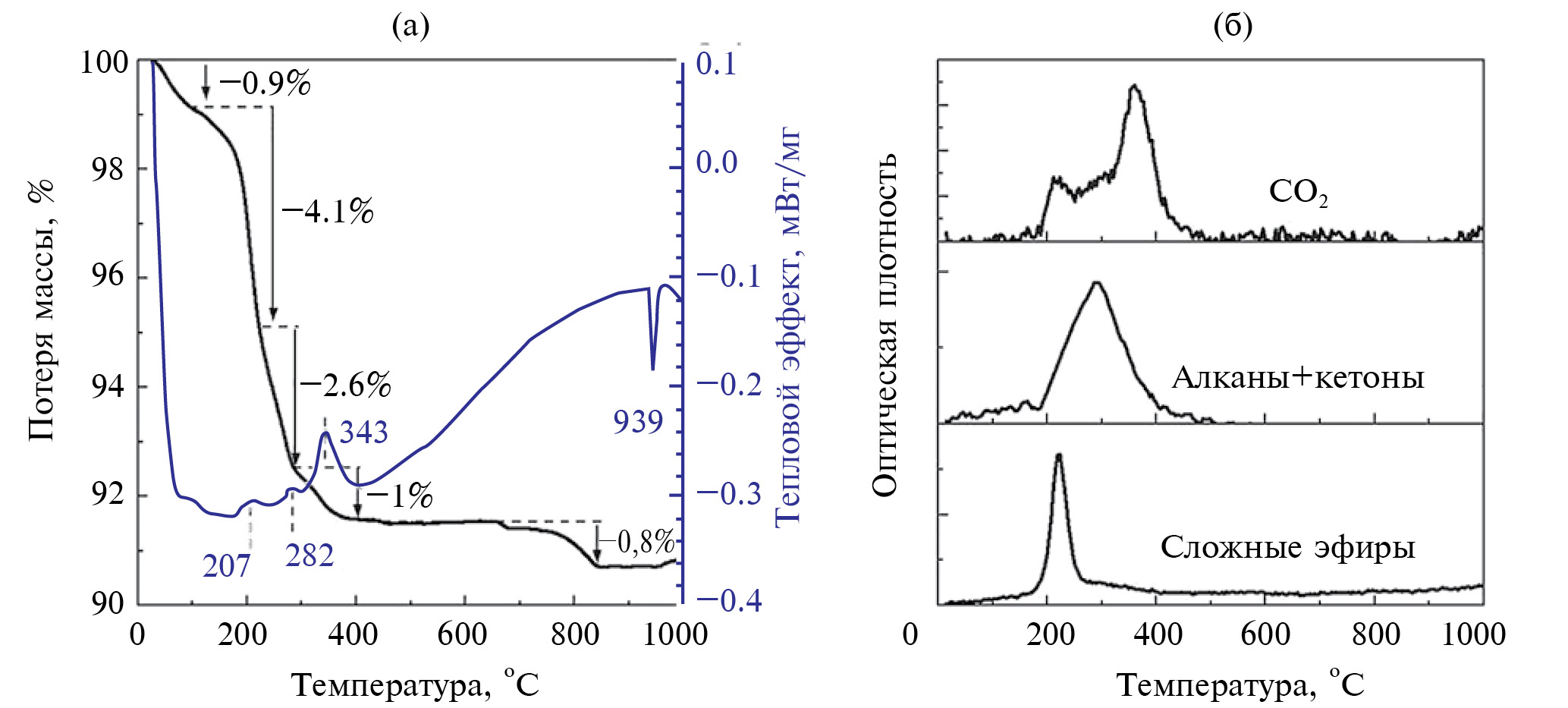 Кривые ТГ и ДСК высушенного органозоля, снятые в воздушной атмосфере, представлены на рис. 6а. На кривой ТГ в интервале температур от 25 до 400°C наблюдалось несколько ступеней потери массы, сопровождающихся слабовыраженными на сильном эндотермическом фоне экзотермическими максимумами при 207 и 282°C, а также экзоэффектом при 343°C. При Т < 100°C происходило удаление растворителя. Анализ отходящих газов (рис. 6б) фиксировал удаление сложных эфиров в интервале 180–260°C (максимум при 220°C), смеси алканов и/или кетонов в интервале 190–390°C (максимум при 290°C) и углекислого газа в интервале 180–400°C. Указанные вещества являются продуктами термического разложения и частичного окисления остатков растворителя и адсорбированных на поверхности наночастиц органических соединений. Снижение массы образца на 0.8% в интервале температур 660–850°C протекало без выраженных тепловых эффектов и не было зарегистрировано в ИК-спектрах. Выраженный эндоэффект на кривой ДСК при 939°C, не сопровождающийся изменением массы, соответствовал плавлению наночастиц серебра, что, вследствие размерных эффектов, почти на 23°C ниже температуры плавления объемного серебра [31].