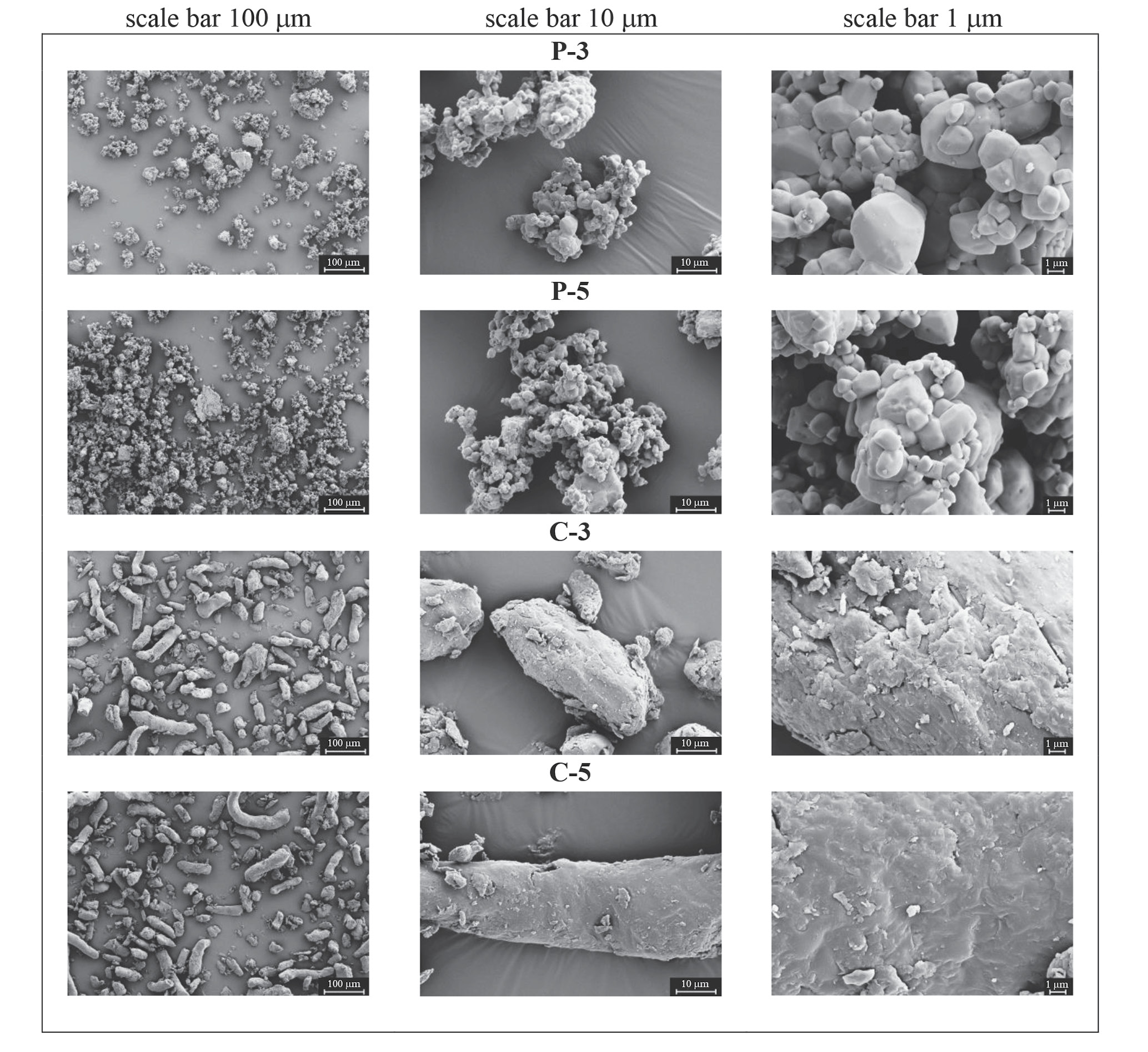 На рис. 1 показаны СЭМ-изображения механоактивированных полимерных порошков ПВС и КМЦ при трех увеличениях. Обнаружено, что ПВС имеет сложную морфологию, представляющую собой агломераты из агрегатов полидисперсных частиц глобулярной формы. Повышение дозы поглощенной энергии от 0.74 до 1.24 кДж/г приводит к увеличению размера агломератов в несколько раз и доли агрегатов частиц с более высокой дисперсностью при сохранении общего характера морфологии, наблюдаемой на микрофотографиях образцов полимера P-3 и P-5. СЭМ-изображения карбоксиметилцеллюлозы после 3 и 5 мин механохимической активации (С-3 и С-5) качественно похожи и свидетельствуют о том, что этот полимер состоит из имеющих многослойную структуру дефектных фибриллярных чешуйчатых волокон различной длины, имеющих многослойную структуру. Следовательно, в результате механического воздействия ударно-сдвигового типа в ПВС формируется агломерационно-агрегативная структура, а в КМЦ повышается степень дефектности волокон.