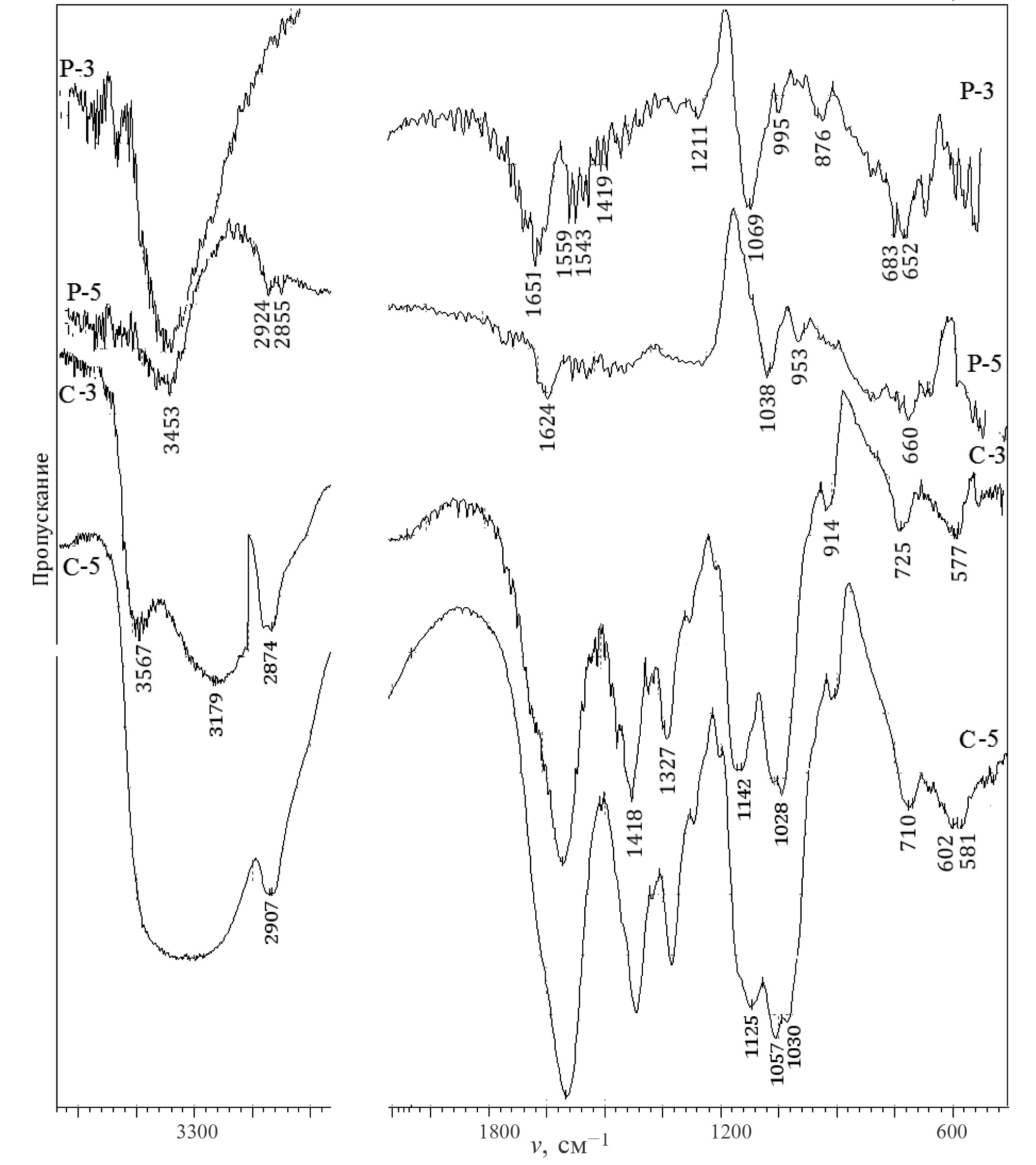 Рис. 3. ИК-спектры механоактивированных поливинилового спирта и карбоксиметилцеллюлозы: P – ПВС; C – КМЦ; 3 и 5 – время механохимической активации, мин.