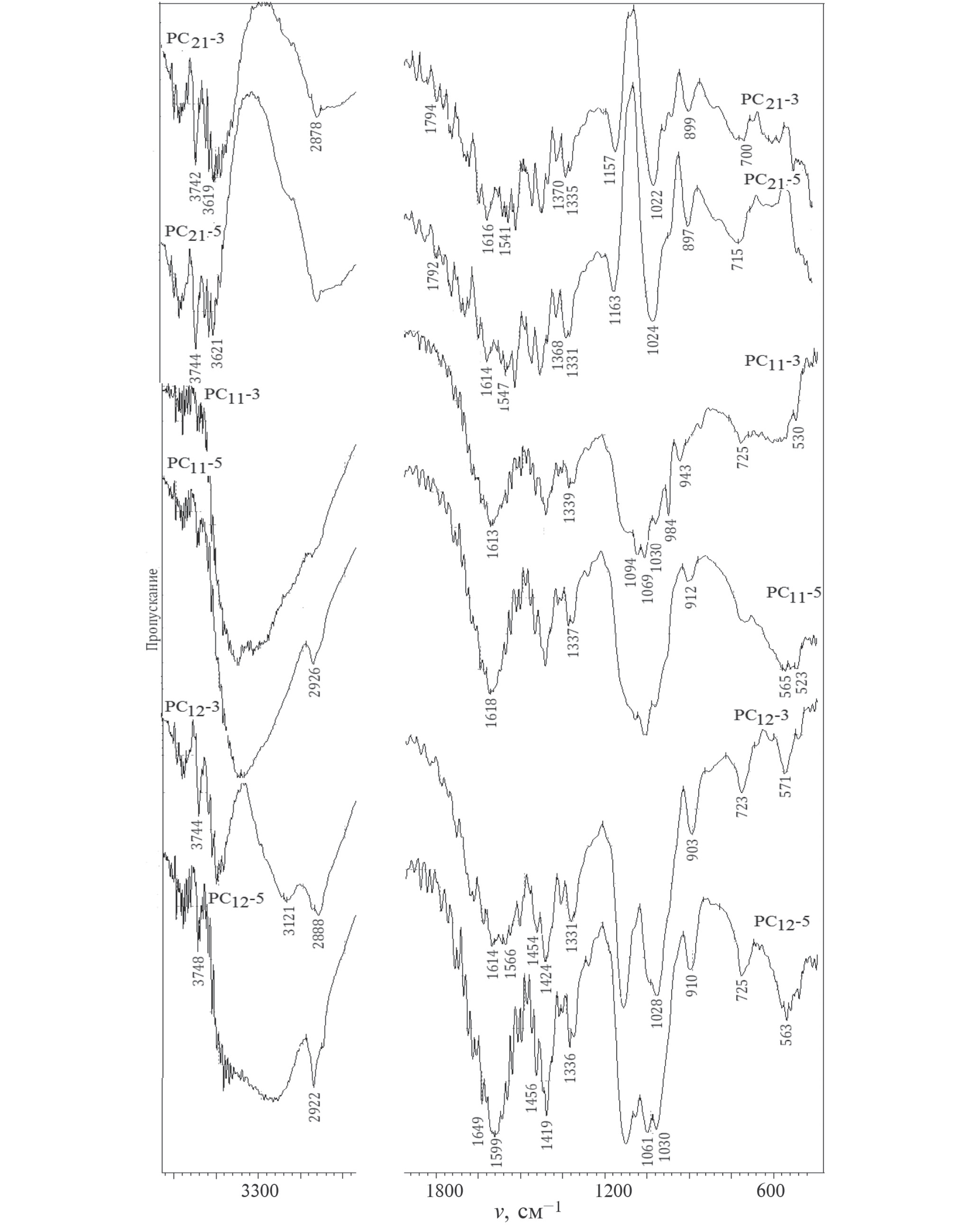 В ИК-спектрах композитов ПВС/КМЦ с соотношением полимеров 2:1 легко увидеть незначительные смещения многих п. п. в высокочастотную область на 2–7 см–1, вызванные уменьшением частиц полимера, и вместе с тем незначительные смещения п. п. в низкочастотную область, указывающие на повышение энергии возбуждения (рис. 3). При эквимассовом соотношении ПВС и КМЦ в ИК-спектрах образцов РС11-3 и РС11-5 наблюдаем смещение характеристической п. п. при 1613 на 5 см–1 в сторону более высоких частот с повышением ее интенсивности. Такой “голубой” сдвиг может указывать на повышение дисперсности частиц порошка, а увеличение относительной интенсивности п. п. на ~29% свидетельствует о повышении содержания карбоксилат-анионных групп. Также имеют место и смещения п. п. в коротковолновую область спектра и исчезновение п. п. при 984 см–1 (РС11-3) после 5 мин механической активации. Изменения в ИК-спектрах композитных образцов с соотношением ПВС и КМЦ 1 : 2 затрагивают область валентных колебаний ОН-групп, С–Н-групп, СОО- и С–О–С-групп (рис. 4). Следовательно, структурные изменения, регистрируемые в ИК-спектрах полимерных композитов, убедительно показывают наличие процессов диспергирования полимерных частиц и также их агрегации с участием водородных связей, возникающих между гидроксильными группами КМЦ и ПВС, и эфирных связей карбоксиметилцеллюлозы.