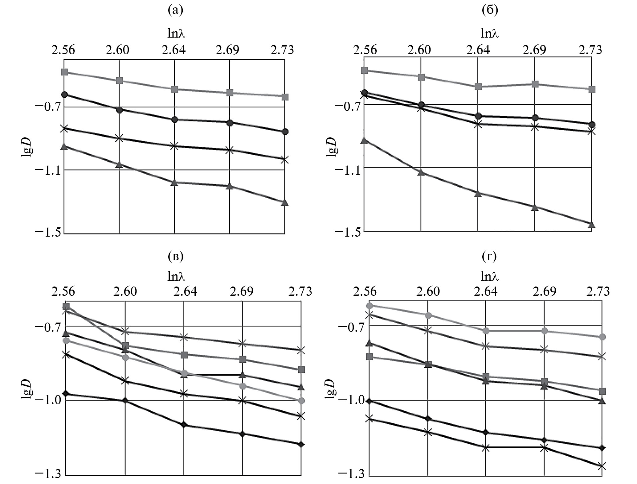 Рис. 6. Зависимость логарифма оптической плотности полимерных растворов от логарифма длины волны для концентраций 1 и 2 г/дл (а, в): —●— С‑3; —■— С‑5; —▲— Р‑3; —×— Р‑5; (б, г): —♦— РС21-3; —■— РС21-5; —▲— РС11-3; —×— РС11-5; —ж— РС12-3; —●— РС12-5.