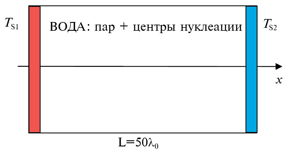 Рассматривается задача об испарении и конденсации воды в присутствии центров конденсации (капель), распределенных в объеме. Схема задачи представлена на рис. 1. Исследуемая область ограничена слева и справа межфазными поверхностями, имеющими известные температуры TS1 и TS2 соответственно. Предполагается, что TS1 > TS2. Заданными также считаются равновесные числовые плотности пара nS1 и nS2, соответствующие по линии насыщения температурам левой и правой поверхностей, а также расстояние между ними. Водяной пар поступает в исследуемую область с ограничивающих границ раздела фаз. Предполагается, что в начальный момент времени расчетная область заполнена водяным паром, концентрация и температура которого равны nS2 и TS2. Через некоторое время в исследуемой области образуются жидкие капли, размеры которых определяются степенью пересыщения пара.
