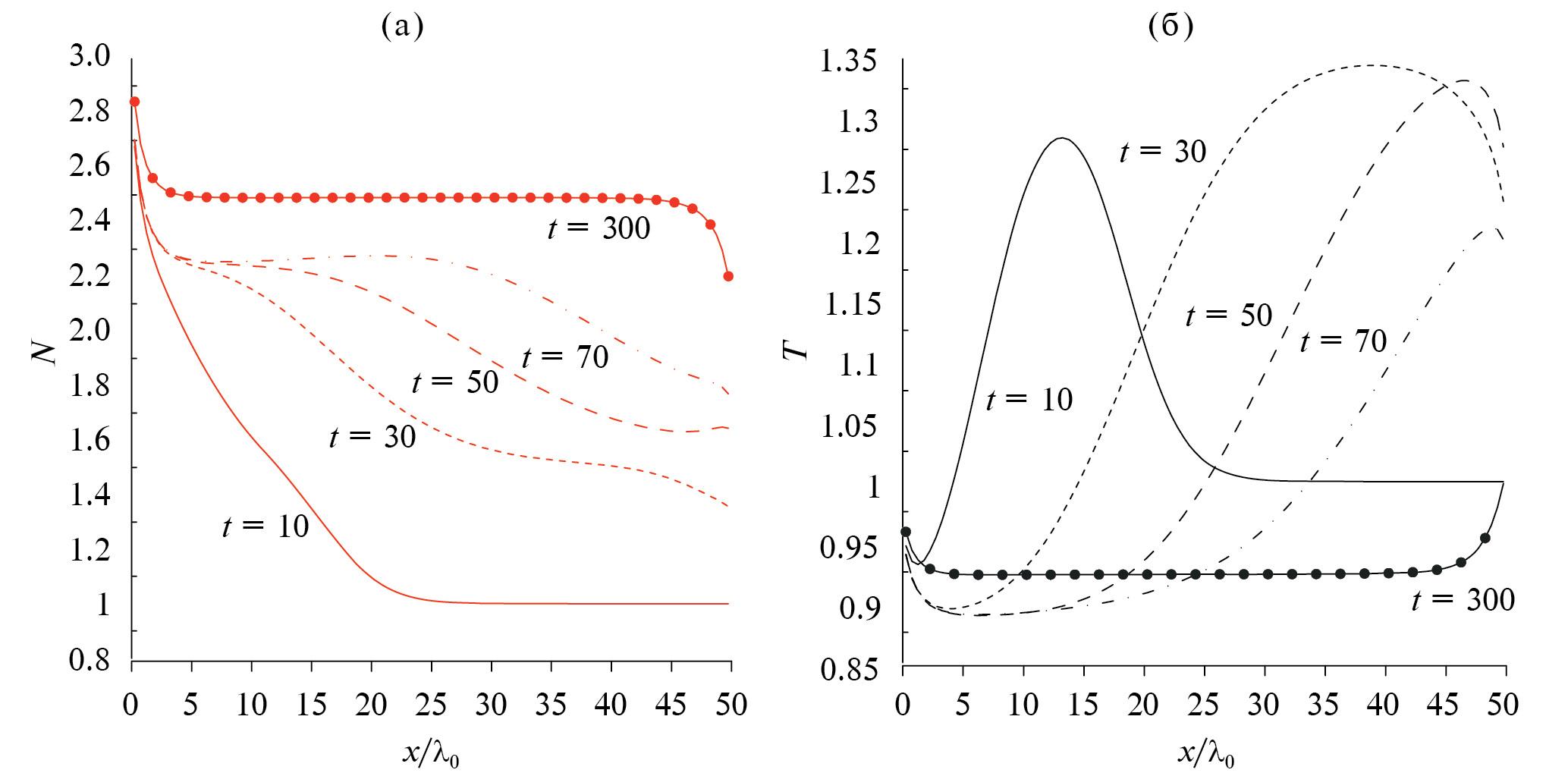 Данные по временным эволюциям макропараметров (плотности и температуры) в исследуемой области представлены на рис. 3. Из сравнения временного поведения пересыщения (рис. 2а) и макропараметров видно, что “фронт” пересыщения распространяется в исследуемой области медленнее, чем волна температуры и плотности. Так, например, из рис. 3 видно, что к моменту времени 30t0 возмущение плотности и температуры достигло холодной поверхности, а максимальное значение пересыщения находится на координате ~4λ0. Координата же половины этой величины равна ~10λ0.