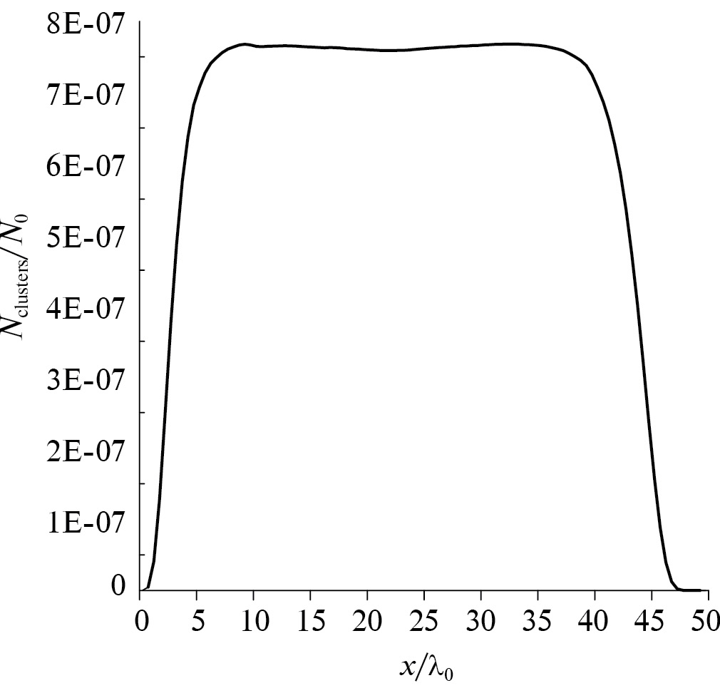 Выражение (12) позволяет определить число кластеров критического радиуса, образующихся в единице объема в единицу времени при известной степени пересыщения. На базе проведенных выше оценок можно считать, что время, в течение которого в исследуемой области идет процесс образования кластеров критического радиуса, составляет t = 300 t0 = 8.409 ∙ 10–7 c. За это время, как показано на рис. 2 и 3, в исследуемой области устанавливаются не только стационарный профиль степени пересыщения, но и стационарные профили макропараметров – плотности, температуры и плотность потока массы. Начальное распределение кластеров, вычисленное по (12) для стационарного профиля степени пересыщения (рис. 2 при t = 300t0), представлено на рис. 4.