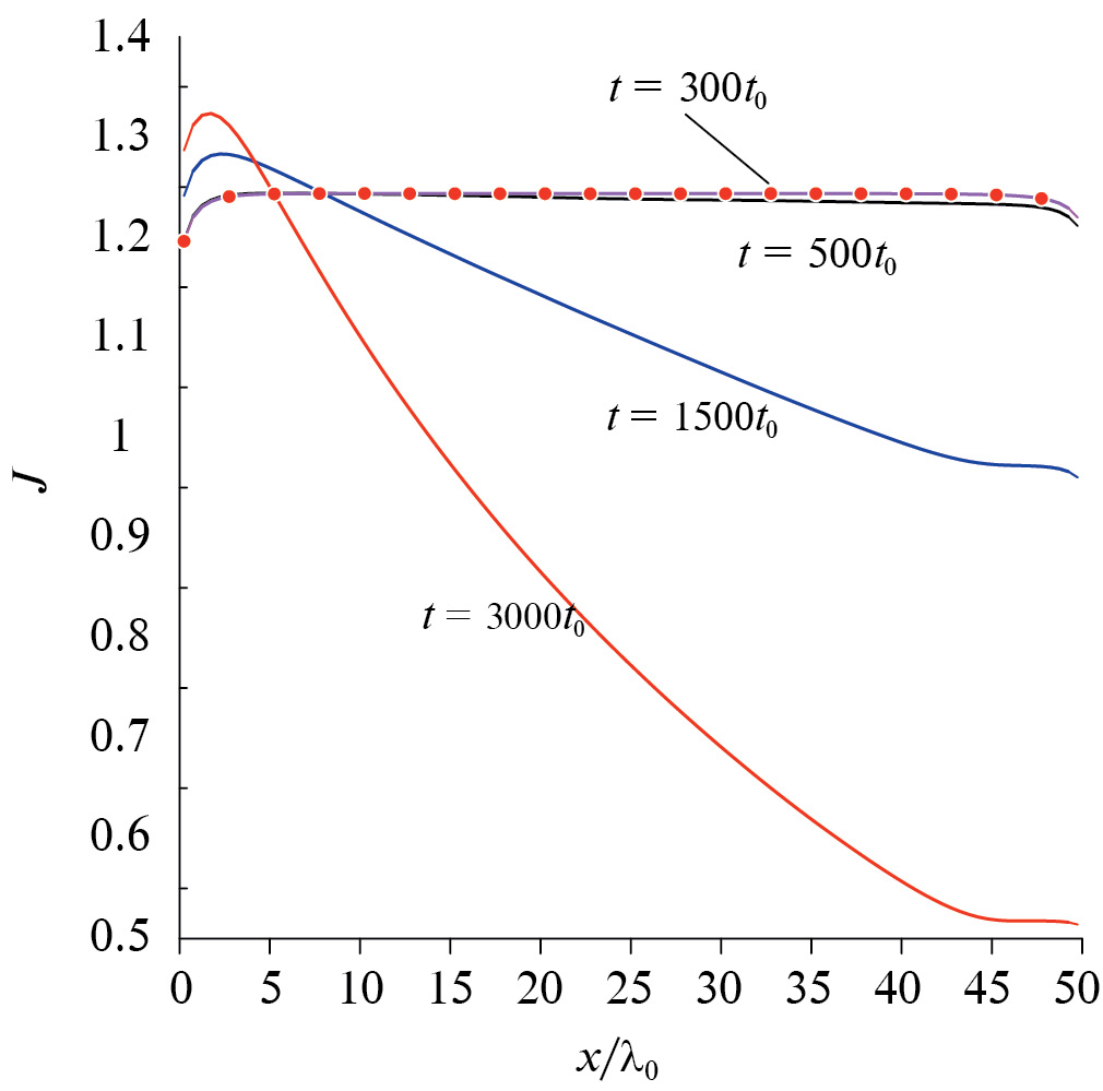 Для оценки влияния капель на изучаемый процесс вычислим время, за которое возмущение дойдет от горячей поверхности до холодной. Потоку массы, показанному линией с красными маркерами на рис. 6, соответствует безразмерная скорость u = 0.5u0. Расстояние между пластинами равно L = 50l0. Тогда время t3 = 50l0/0.5u0 = 100t0, т. е. t3 < t1. Важно отметить, что в данной модели центры конденсации являются неподвижными, а также их количество не меняется. Но если бы частицы могли двигаться вместе с потоком пара, исчезать на холодной поверхности и вновь образовываться в объеме, они не успели бы увеличить свои размеры в достаточной степени. Таким образом, полученные результаты для неподвижных капель могут быть использованы для выяснения степени влияния процесса гомогенной нуклеации на интенсивность испарения/конденсации в случае движущихся центров конденсации. Как показывают оценки характерных времен, а именно времени t1, в течение которого образовавшиеся капли не влияют на макропараметры в исследуемой области, и времени t3 – движения пара от поверхности испарения к поверхности конденсации, влияние центров конденсации на течение пара в случае их движения со скоростью потока при t3 < t1 не наблюдалось бы.