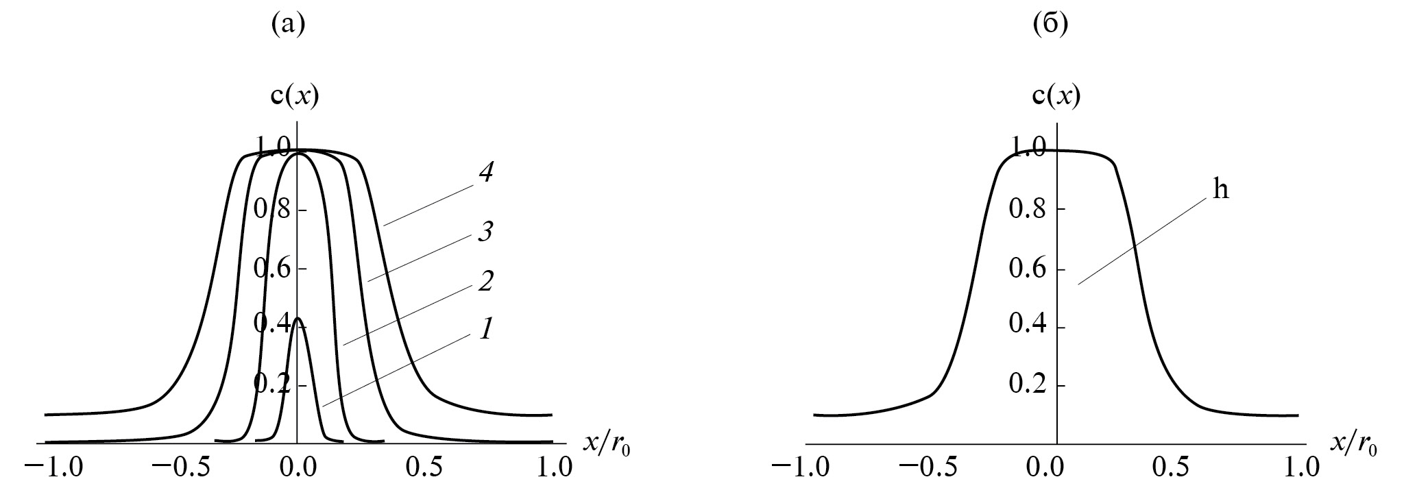 Поэтому для сплавов на основе железа были выбраны значения: eAA = 0.6687 ⋅ 10–19 Дж, bAA = = 1.3885 ∙ 1010 м–1 и r0,AA = 2.845 ∙ 10–10 м [13]. Потенциалы взаимодействия для разноименных атомов в сплавах в большинстве случаев либо неизвестны совсем, либо известны с большими погрешностями. Поэтому при их выборе можно ограничиться лишь общими физическими предположениями. А именно, будем считать, что атомы примеси имеют больший размер, чем у атомов железа, это соответствует тому, что r0,AB > r0,AA и bAB > bAA. Из экспериментов известно, что распределение концентрации таких атомов в объеме сплава имеет на границах вид сгущения колоколообразной формы [2].