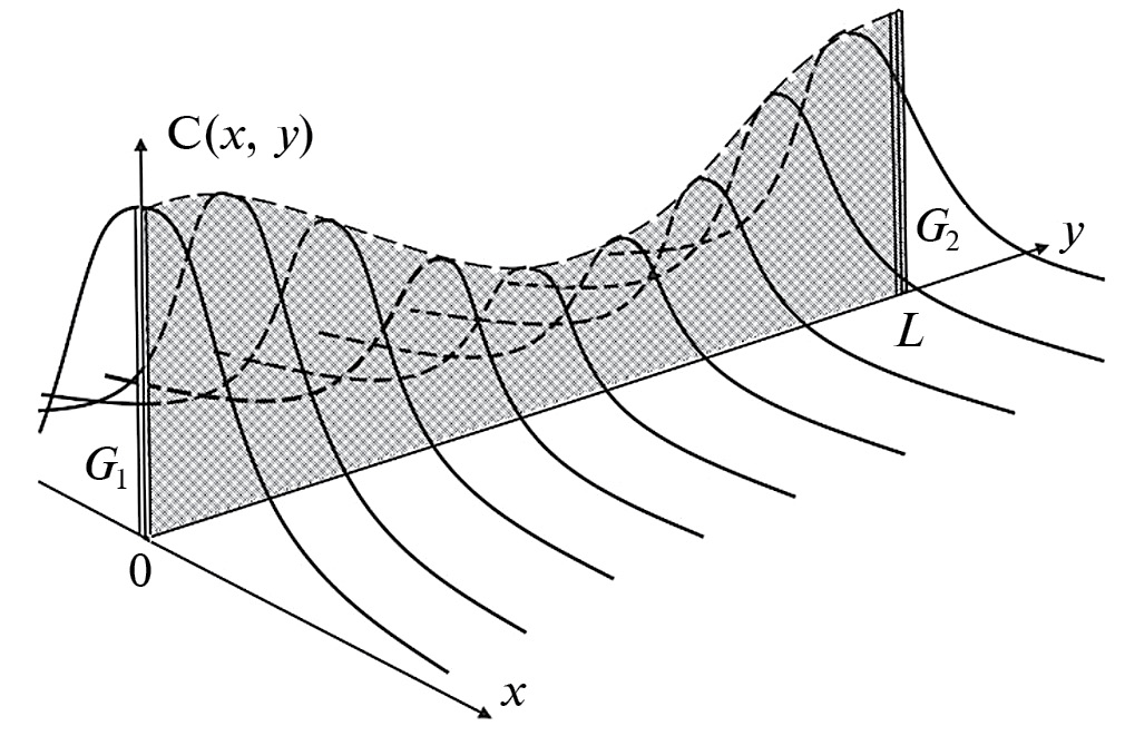 Поэтому анализ решений уравнения (11) удобно проводить в два этапа. На первом этапе следует зафиксировать значение координаты y. Тогда распределение концентрации примеси будет определяться расстоянием вдоль оси x от границы (рис. 2) [13]. На втором этапе следует зафиксировать значение координаты x. Тогда распределение концентрации примеси будет определяться расстоянием вдоль оси y, лежащей в плоскости границы.