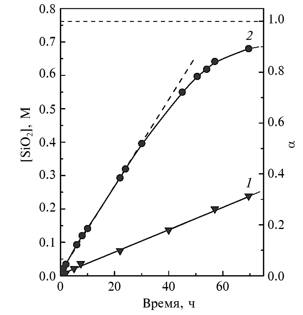 На рис. 1 показаны экспериментальные зависимости изменения концентрации SiO2 от времени в ходе гетерогенного гидролиза ТЭОС в условиях двух режимов перемешивания реакционной смеси: с сохранением неразрывности границы раздела фаз ТЭОС/вода (прямая 1) и эмульсионного режима перемешивания (кривая 2). Температура реакции составляла 60°C, концентрация L-аргинина – 6 мМ, объем водного раствора – 250 мл, объем ТЭОС – 50 мл, что при степени конверсии ТЭОС α = 1 соответствует максимальной концентрации [SiO2] = 0.76 M (горизонтальная пунктирная линия, рис. 1). Эмульсионный режим перемешивания реакционной смеси является предпочтительным ввиду более высокой производительности процесса по диоксиду кремния.