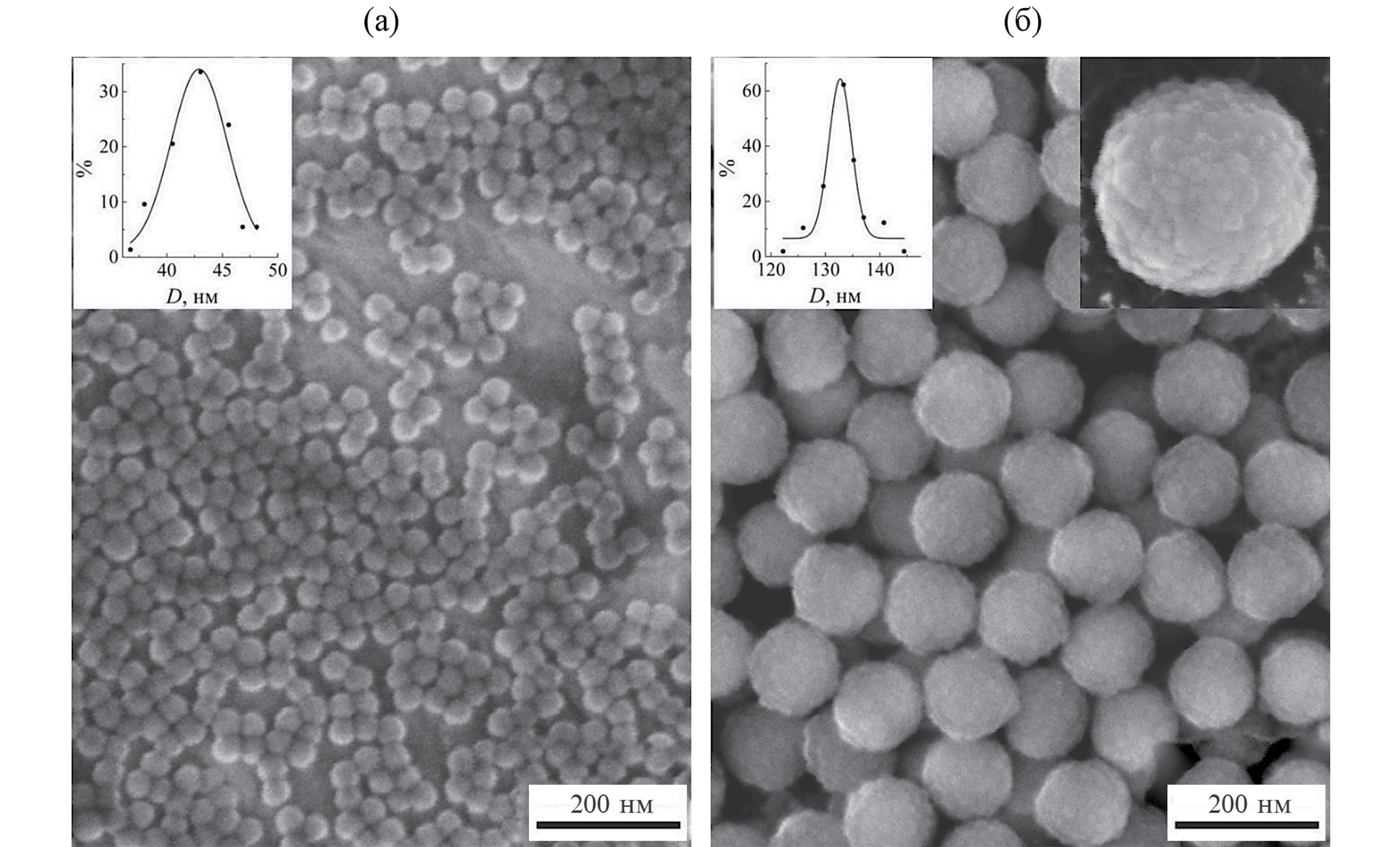 На рис. 6а представлено СЭМ-изображение наночастиц кремнезема, полученных путем гетерогенного гидролиза ТЭОС в присутствии L-аргинина в качестве катализатора. Концентрация L-аргинина в водном растворе составляла 7.5 мМ, объем воды и ТЭОС составляли 500 и 110 мл соответственно, температура синтеза поддерживалась равной 90°C, вращение магнитной мешалки со скоростью 500 об./мин обеспечивало эмульсионный режим перемешивания двухкомпонентной системы. Продолжительность синтеза составила 5 ч. Полученные частицы диоксида кремния диаметром 42.9 ± 2.5 нм (рис. 6а) были использованы в качестве затравок для дальнейшего их доращивания. Для этого часть коллоидной суспензии была диспергирована в водном растворе L-аргинина (2 мМ), а доращивание в условиях гетерогенного гидролиза ТЭОС проводилось в более мягких условиях: температура реакции составляла 60°C, режим перемешивания при вращении мешалки ~200 об/мин соответствовал условию “сохранения целостности границы раздела жидких фаз”. На рис. 6б показано СЭМ-изображение частиц SiO2, достигших диаметра 132.7 ± 2.1 нм. Как видно из рисунка, частицы характеризуются хорошей монодисперсностью. Поверхность получаемых таким методом частиц обычно “шероховатая” (см. врезку на рис. 6б) в отличие от “гладкой” поверхности традиционных штоберовских частиц. Это отличие связано с тем, что при гетерогенном доращивании концентрация растворенного кремнезема (Si(OH)4) сохраняется на протяжении всего синтеза, а в случае гомогенного ступенчатого доращивания частиц модифицированными методами Штобера концентрация растворенного кремнезема в конце ступени роста падает до значений, когда рост происходит преимущественно за счет присоединения к растущей поверхности низкоразмерных частиц SiO2 и мономеров Si(OH)4.