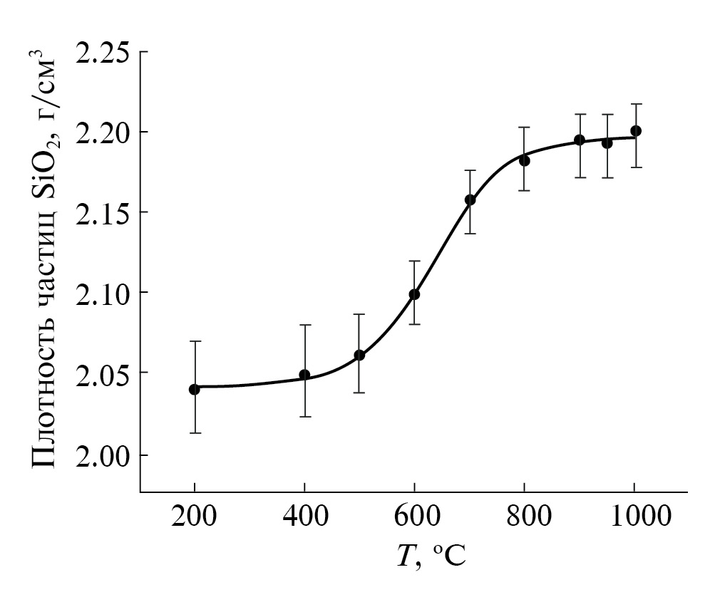 Плотность и пористость выращенных частиц диоксида кремния исследовали методом гидростатического взвешивания. На рис. 8 представлена зависимость плотности частиц SiO2 диаметром 300 нм от температуры их термообработки в течение 24 ч в диапазоне температур 200–1000°C.
