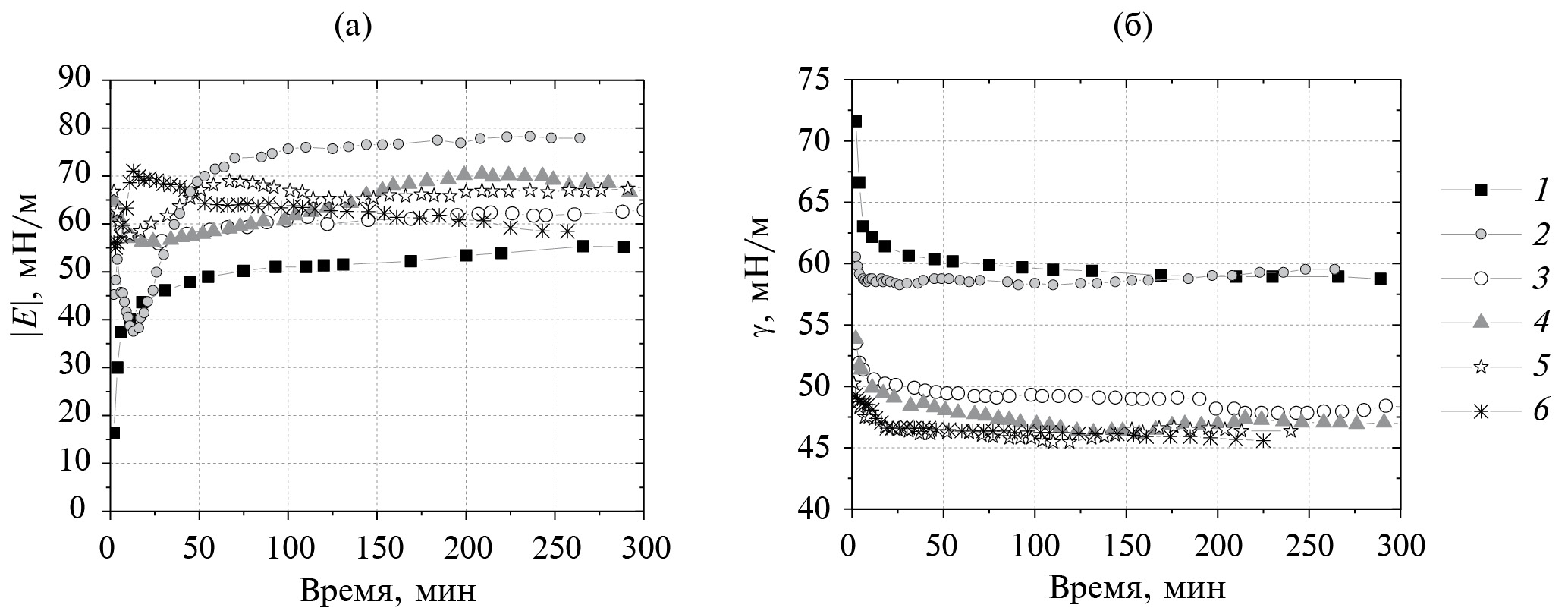 Поскольку для исследуемых систем мнимая часть динамической поверхностной упругости была меньше действительной части, то в работе представлены результаты для модуля динамической поверхностной упругости.