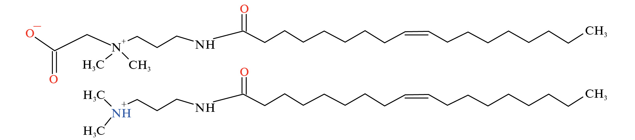 Целью данной работы является исследование растворов смешанных мицелл цвиттерионного ПАВ олеиламидопропилдиметил карбоксибетаина (ОАПБ) и положительно заряженного олеиламидопропилдиметил амина (ОАПА), имеющих полностью идентичные гидрофобные группы. В целом положительно заряженный ОАПА имеет очень близкое строение с цвиттерионным ОАПБ (рис. 1), но отличается только отсутствием карбоксильной группы и метильной группы, соединяющей заряженные группы ОАПБ. Отметим, что цвиттерионное ПАВ ОАПБ образует червеобразные мицеллы в отсутствие добавок благодаря длинной гидрофобной группе [24]. Таким образом, варьируя долю ОАПА в смеси с ОАПБ, можно исследовать влияние электростатических взаимодействий на вязкоупругие свойства и структуру червеобразных мицелл на основе цвиттерионного ПАВ, не изменяя гидрофобные взаимодействия в мицеллах.
