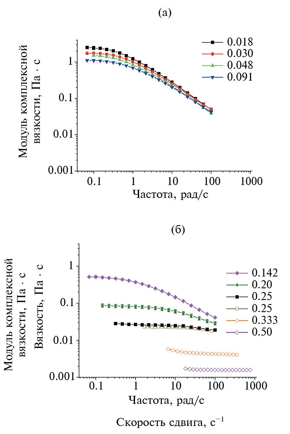 Рис. 2. Частотные зависимости модуля комплексной вязкости (закрашенные символы) и зависимости вязкости от скорости сдвига (пустые символы) для растворов ОАПБ с разной долей ОАПА, указанной на графиках: (а) в области слабой зависимости вязкости от доли ОАПА и (б) в области падения вязкости при увеличении доли ОАПА.
