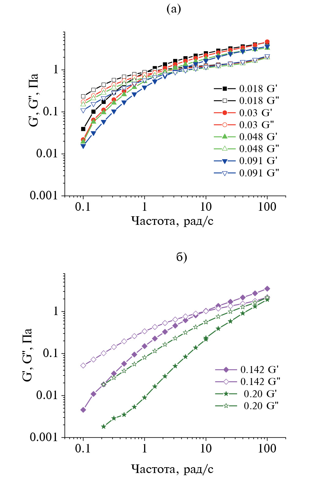 Рис. 3. Частотные зависимости модуля накопления G' (закрашенные символы) и модуля потерь G" (пустые символы) для растворов (а) до 0.1 ОАПА в смеси с ОАПБ; (б) более 0.1 ОАПА в смеси с ОАПБ. Мольные доли ОАПА в смеси с ОАПБ представлены на графиках.