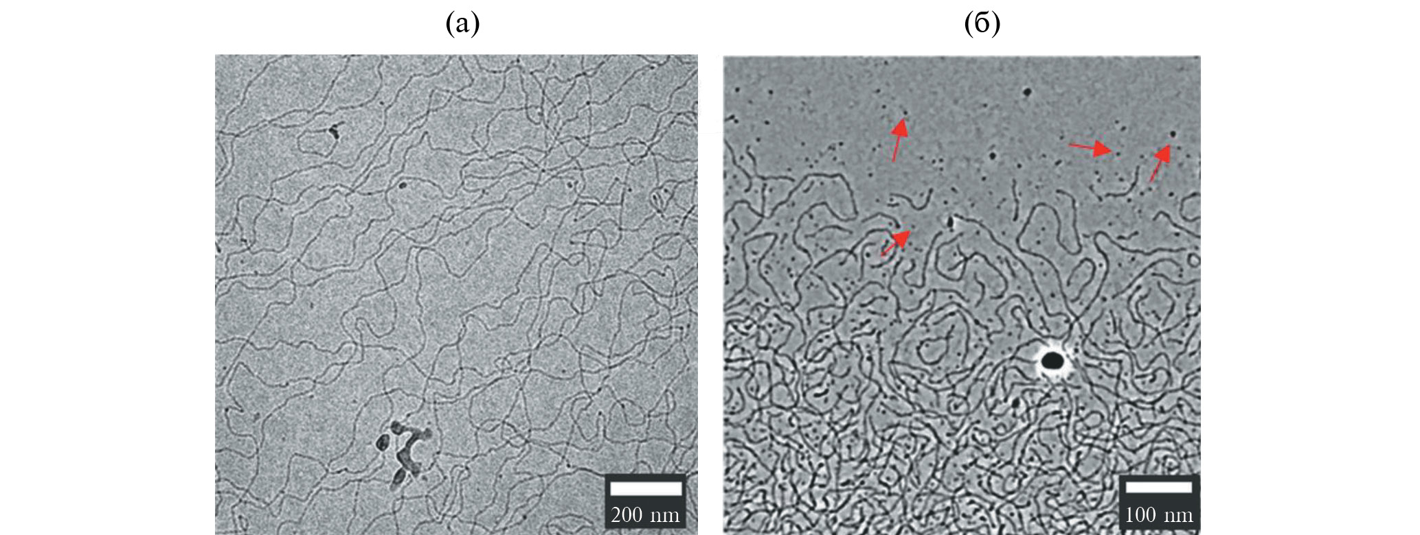 Структура растворов была исследована методом криогенной электронной микроскопии как для случая вязкоупругого раствора, так и для случая раствора наименьшей вязкости. На рис. 4 представлено изображение структуры раствора ОАПБ при малой доле ОАПА (0.018). Видно, что в этих условиях образуются линейные червеобразные мицеллы ПАВ, длина и количество которых достаточно велики, чтобы обеспечить образование сетки топологических зацеплений, что является причиной вязкоупругого отклика раствора [31]. С учетом масштаба изображения и отсутствия торцевых частей на картине, можно предположить, что длина червеобразных мицелл составляет не менее нескольких микрометров. Толщина червеобразных мицелл, согласно данным крио-ПЭМ, составляет 5.5 ± 0.5 нм. Это согласуется с длинами молекул используемых ПАВ [24, 32], т. е. в поперечном сечении мицелла представляет собой окружность с радиусом, равным длине молекул ПАВ. При доле ОАПА 0.50 на изображении крио-ПЭМ наблюдается смесь относительно коротких червеобразных мицелл ПАВ, длина которых варьируется в широких пределах от 20 нм до сотен нанометров, и сферических мицелл ПАВ. Уменьшение средней длины червеобразных мицелл было предположено выше из-за уменьшения вязкости растворов, но образование одновременно длинных червеобразных и сферических мицелл достаточно неожиданно. Широкое распределение по размерам червеобразных мицелл предсказано теоретически [31] и показано экспериментально [7], но сосуществование длинных червеобразных мицелл и большого количества сферических мицелл достаточно редко встречается в литературе. Оно было обнаружено ранее, например, для смешанных мицелл катионного и анионного ПАВ [13]. Было показано, что смесь таких мицелл образуется при большой доле анионного ПАВ, склонного образовывать сферические мицеллы. Было высказано предположение о том, что возможно неравномерное распределение ПАВ в мицеллах разных типов.