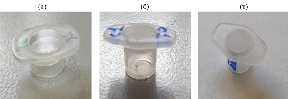 Рис. 2. Образцы льда во втулках после отрыва от гладкой гидрофобной (а) и супергидрофобной (б, в) поверхностей.