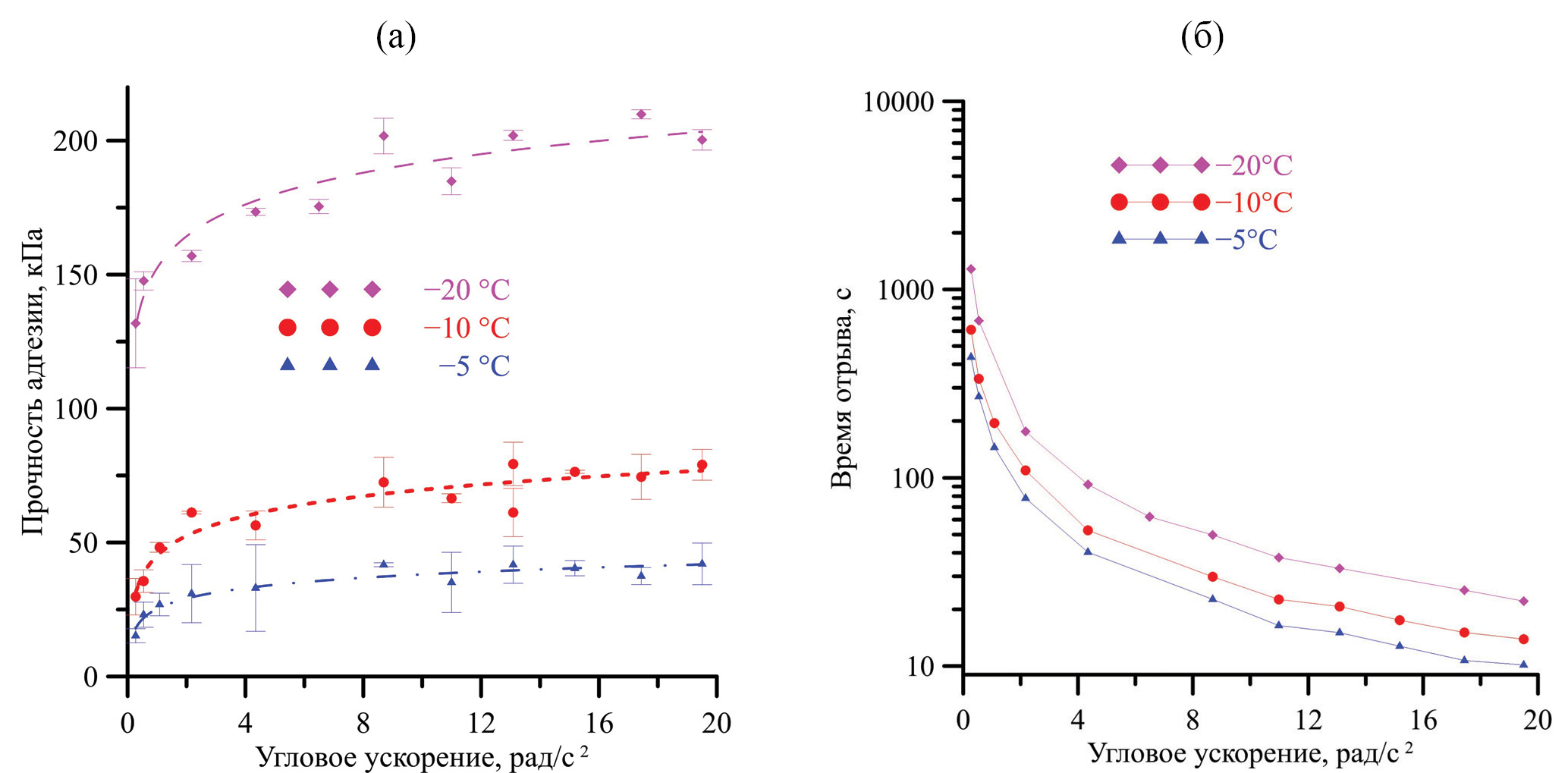 Экспериментально измеренная зависимость сдвиговой прочности адгезионного контакта от углового ускорения центрифуги, которое характеризует скорость приложения нагрузки (скорость изменения центробежной силы) к втулке со льдом, представлена на pис. 3а. Данные были получены при трех температурах на одних и тех же образцах. Здесь следует отметить, что слабая деградация супергидрофобного состояния, обнаруженная по изменению смачивания на образцах после завершения экспериментов по отрыву льда, могла приводить к увеличению прочности адгезионного контакта с увеличением числа отрывов льда от поверхности. Однако в наших экспериментах значимого возрастания адгезии не наблюдалось. На это указывал тот факт, что измерения при одинаковых угловых ускорениях и температурах проводились многократно, и результаты измерения, например, на первом, 20-м и 57-м циклах отрыва не отличались в пределах разброса, определяемого по 24 образцам в одном цикле отрыва.