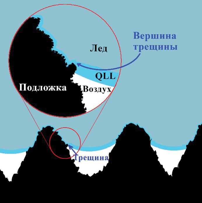 Рис. 4. Схема к обсуждению механизма формирования трещины на межфазной границе лед – подложка. Здесь QLL обозначает квазижидкий водный слой.