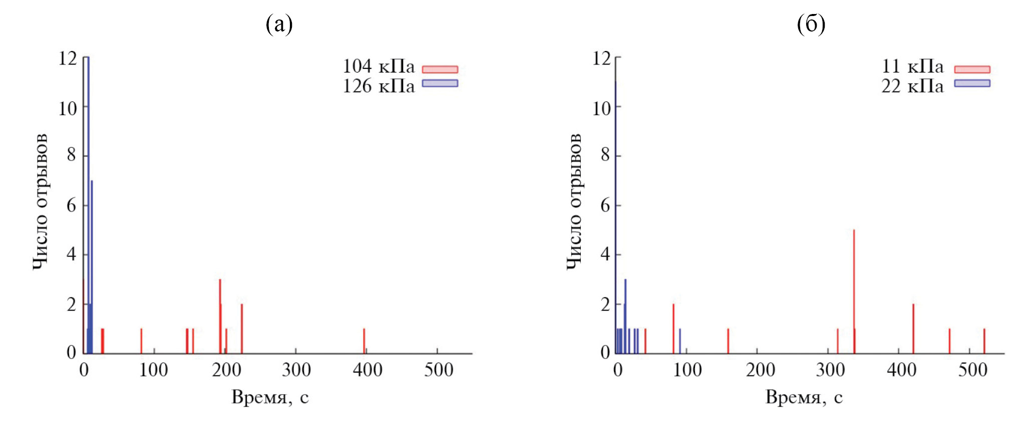 Рис. 5. Распределение моментов отрыва льда во времени воздействия постоянной сдвиговой нагрузки при температурах –20°C (а) и –5°C (б). Нагрузка в 104 кПа соответствует 60%, а 126 кПа – 72% от средней сдвиговой прочности отрыва льда при непрерывном увеличении нагрузки с угловым ускорением 4.35 рад/сек2 для температуры –20°C; 11 и 22 кПа составляют 33.5 и 67% от соответствующей величины для –5°C.
