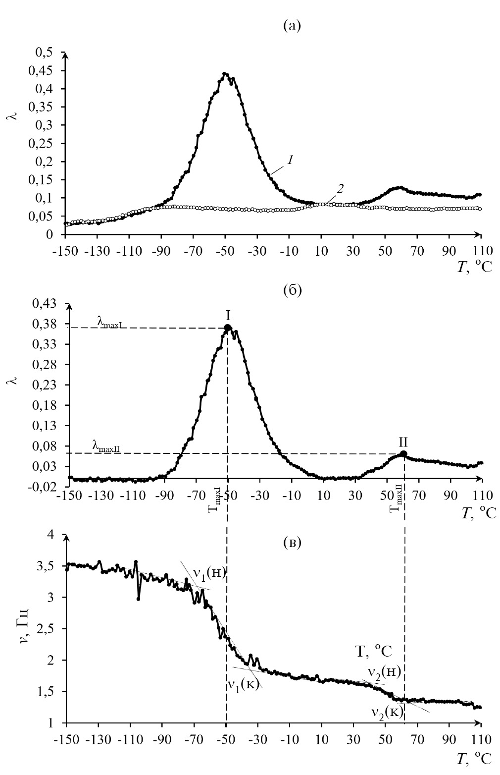 Рис. 5. Спектр внутреннего трения λ = f(T) композитной системы “ПЭПА–целлюлоза” (кривая 1) и целлюлозной подложки (кривая 2) – (а); спектр λ = f(T) этой же композитной системы “ПЭПА–целлюлоза” без диссипативных потерь, вносимых целлюлозной подложкой – (б); температурная зависимость частоты ν = f(T) в композитной системе “ПЭПА–целлюлоза” – (в).
