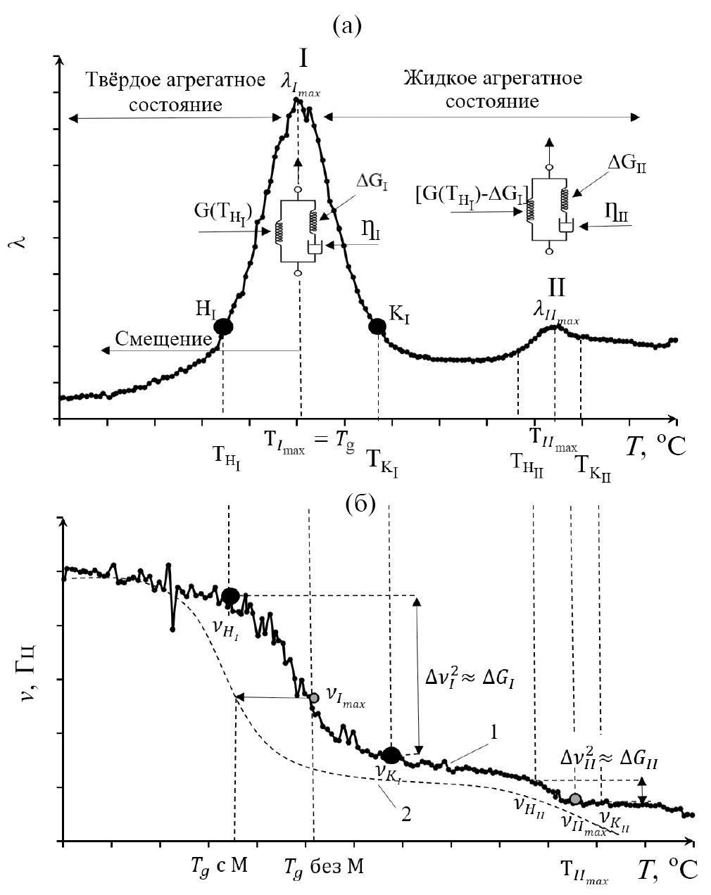 Рис. 7. Обобщенное схематическое изображение соотношения твердого и жидкого агрегатного состояния в отвердителе; а – спектр внутреннего трения λ = f(T), б – температурная зависимость частоты ν = f(T).