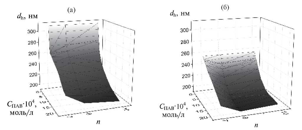 Высокие значения оптической плотности дисперсий УНТ, свидетельствующие о большом содержании углеродного наноматериала в объеме дисперсии, не могут дать достоверной информации о размерах частиц в коллоидной системе. Средний гидродинамический размер частиц в дисперсиях УНТ определен методом динамического рассеяния света [46]. На рис. 2 приведены 3D-графики зависимости среднего гидродинамического диаметра (СГД) dh частиц дисперсий УНТ от средней степени оксиэтилирования и концентрации ОЭ ВЖС в водных растворах через 1 сутки (рис. 2а) и через 30 суток (рис. 2б) после УЗ-обработки.