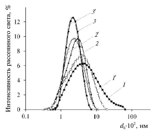 Рис. 3. Распределение частиц по размерам в дисперсиях, полученных при ультразвуковой обработке УНТ в воде (1, 1') и в водных растворах ОЭ ВЖС n = 10 (2, 2' – 6.3·10–4 моль/л; 3, 3' – 20.0∙10–4 моль/л) через 1 сутки (1, 2, 3) и через 30 суток (1', 2', 3').