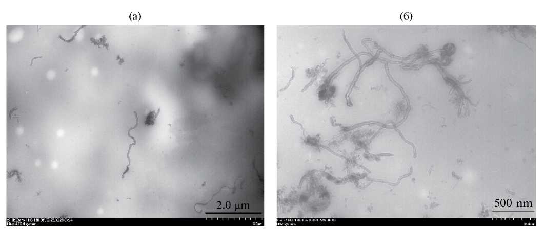 Рис. 6. Микрофотографии гелевых систем, полученных с помощью дисперсий УНТ в воде (а, масштаб 2 мкм) и водном растворе ОЭ ВЖС n = 10 (б, масштаб 500 нм).
