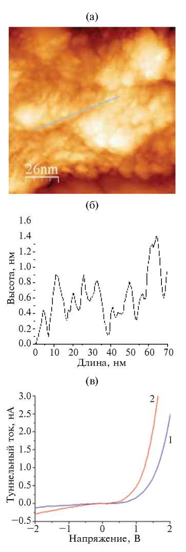 Рис. 3. Окисленный монокристалл кремния с нанесенными наночастицами никеля: а –топографическое изображение участка поверхности, б – профиль вдоль линии, указанной на топографическом изображении, в – ВАХ подложки (кривая 1) и наночастиц (кривая 2).