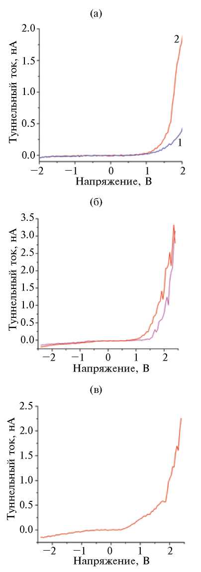 Взаимодействие наночастиц Pt с О2 (экспозиция – 2000 Л) приводит к увеличению ширины участка нулевого тока на ВАХ платины до 2–2.2 В, примеры кривых приведены на рис. 6б. На рисунке представлены кривые ВАХ, измеренные на разных наночастицах платины. Это означает, что на поверхности наночастиц образовался полупроводник с шириной запрещенной зоны 2–2.2 эВ. Полупроводником с такими характеристиками может являться β-PtO2. Т.е. произошло повторное образование оксида на поверхности наночастиц платины. Их окисление оказалось возможным уже при Т = 300 К в отличие от окисления наночастиц платины на ВОПГ, которое возможно только при увеличении температуры образца до Т = 700 К [27]. Как и в случае наночастиц никеля, наиболее вероятной причиной различия адсорбционных и реакционных свойств наночастиц платины, нанесенных на ВОПГ и кремний, стала химически активная подложка – окисленный кремний.