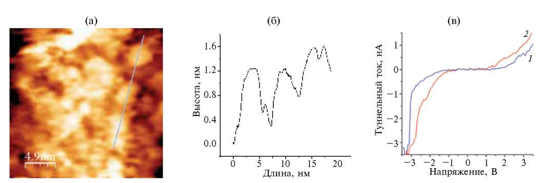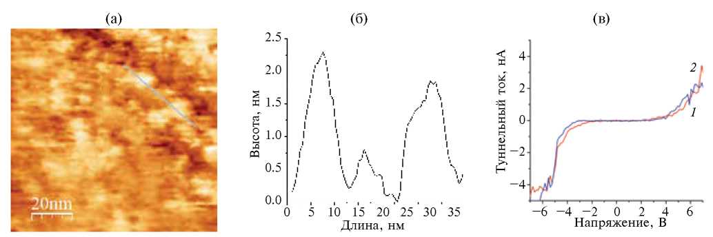 Рис. 5. Окисленный монокристалл кремния с нанесенными наночастицами платины: а –топографическое изображение участка поверхности, б – профиль вдоль линии, указанной на топографическом изображении, в – ВАХ подложки (кривая 1) и наночастиц (кривая 2).