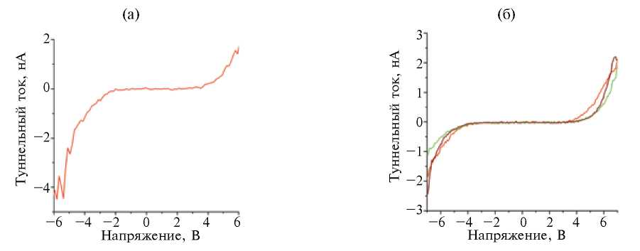 Рис. 6. ВАХ наночастиц платины, нанесенных на поверхность окисленного кремния (а) после экспозиции в Н2, (б) после экспозиции в O2.
