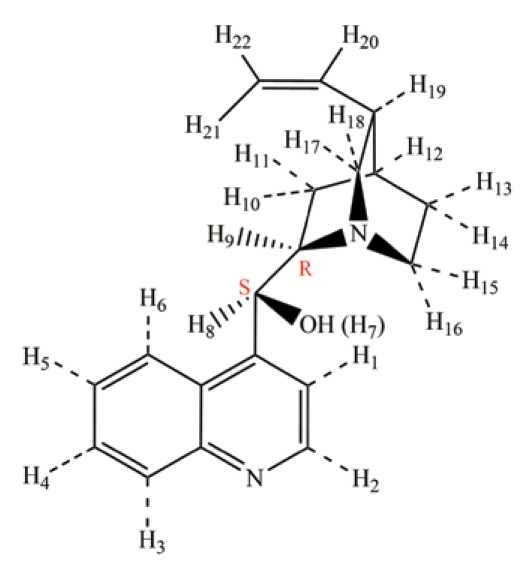 Рис. 1. Обозначение атомов в молекулах (8S,9R)-цинхонидина и его протонированных форм.
