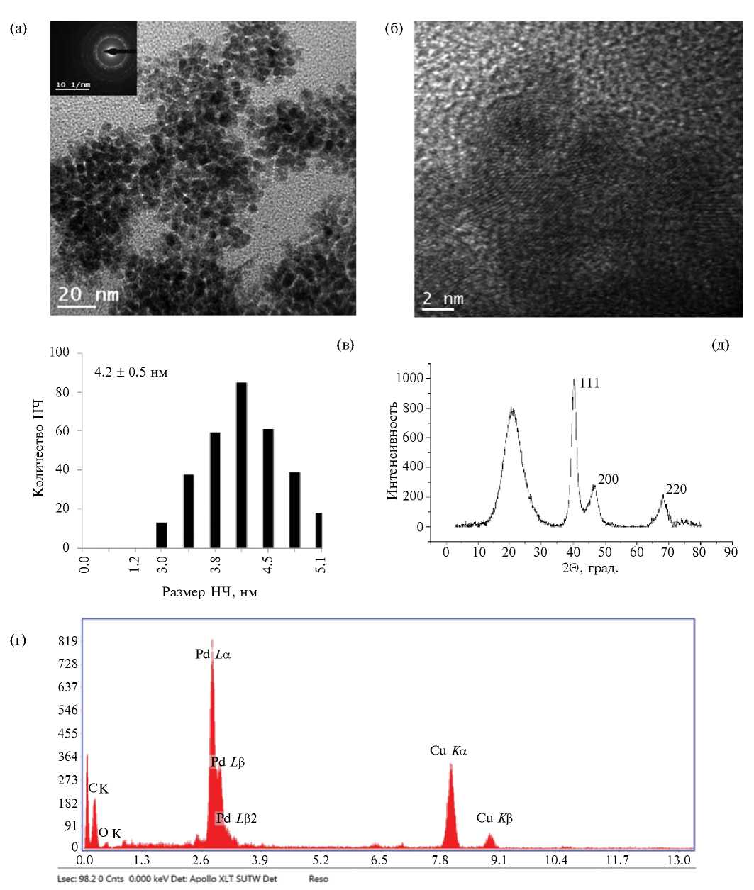 Рис. 2. ПЭМ ВР микрофотографии каталитической системы Pd(Acаc)2–1–H2 и спектр РФА образца, выделенного из нее: а) микрофотография в масштабе 20 нм, вставка – дифракционная картина (SAED) от наночастиц Pd, б) микрофотография в масштабе 5 нм, в) гистограмма распределения наночастиц по размерам, д) спектр РФА выделенного образца, г) энергодисперсионный спектр (ЭДС) наночастиц палладия.