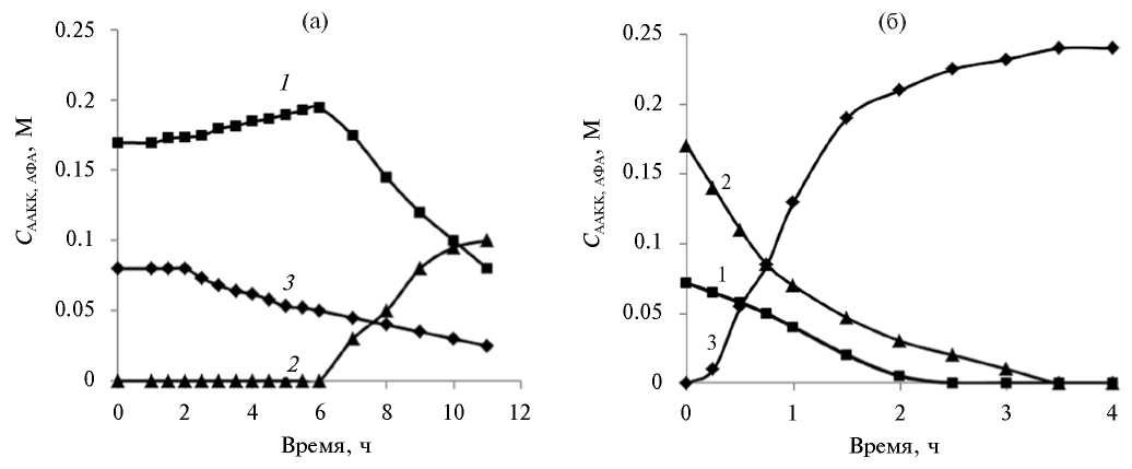 Рис. 4. Гидрирование изомеров α-ААКК1 (1) и α-ААКК2 (2) на каталитической системе Pd(Аcac)2–1–H2 с образованием N-АФА (3) (а) Т = 25°С; б) Т = 60°С; PН2 = 5 Бар, растворитель – смесь толуол : метанол = 3 : 17).