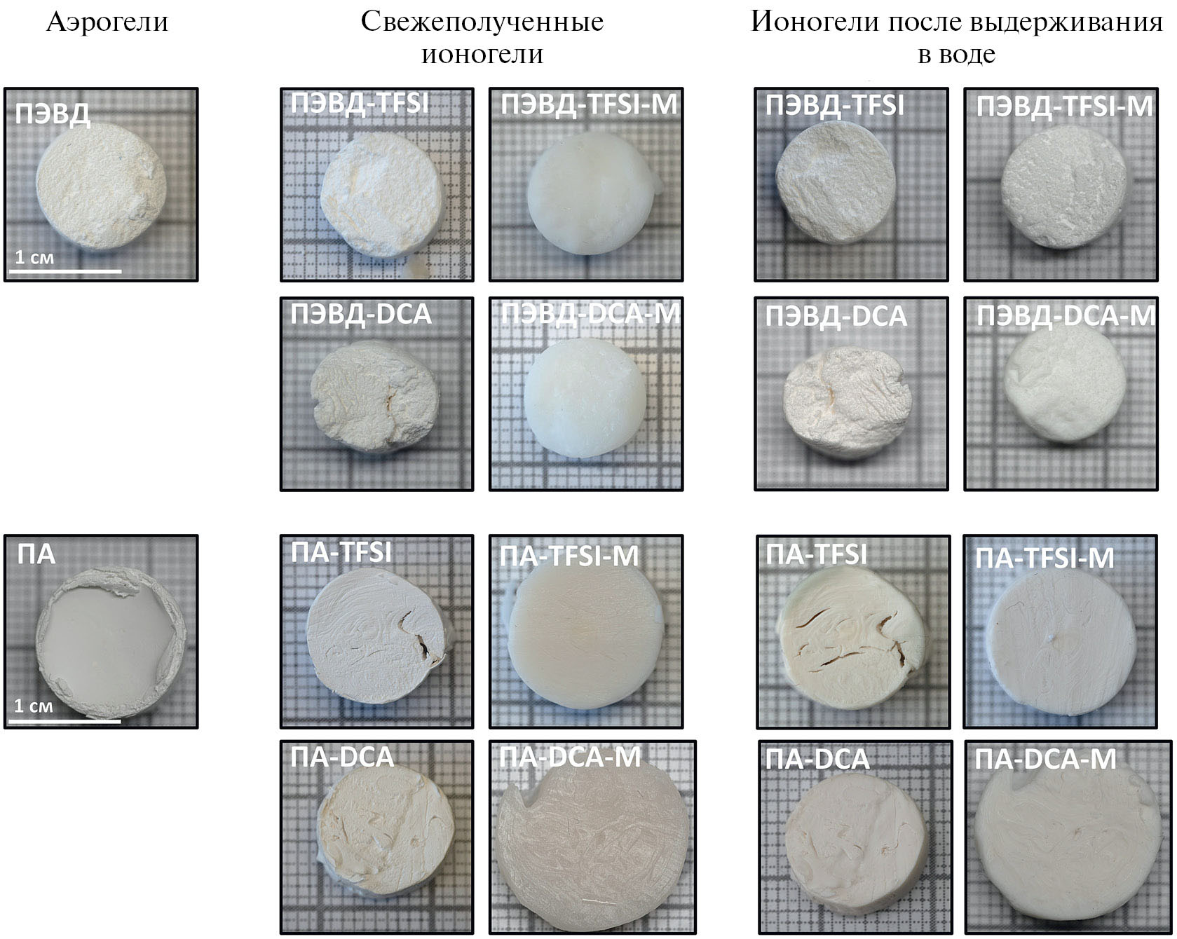 После сверхкритической сушки образцы высокопористых полимеров ПА и ПЭВД представляли собой монолиты цилиндрической формы белого цвета (рис. 2). В результате их пропитки ионными жидкостями существенных изменений их размера не наблюдали, за исключением образцов ПА-TFSI-M и ПА-DCA-M, продемонстрировавших увеличение линейных размеров, связанное с высокой сорбционной емкостью высокопористого полиамида-6.6 по отношению к соответствующим ионным жидкостям (11 и 7 г/г соответственно). Внешний вид ионогелей после их выдерживания в воде в течение суток несколько изменился по сравнению с исходным состоянием – в них появились макротрещины (например, образец ПА-TFSI), поверхность стала более шероховатой.