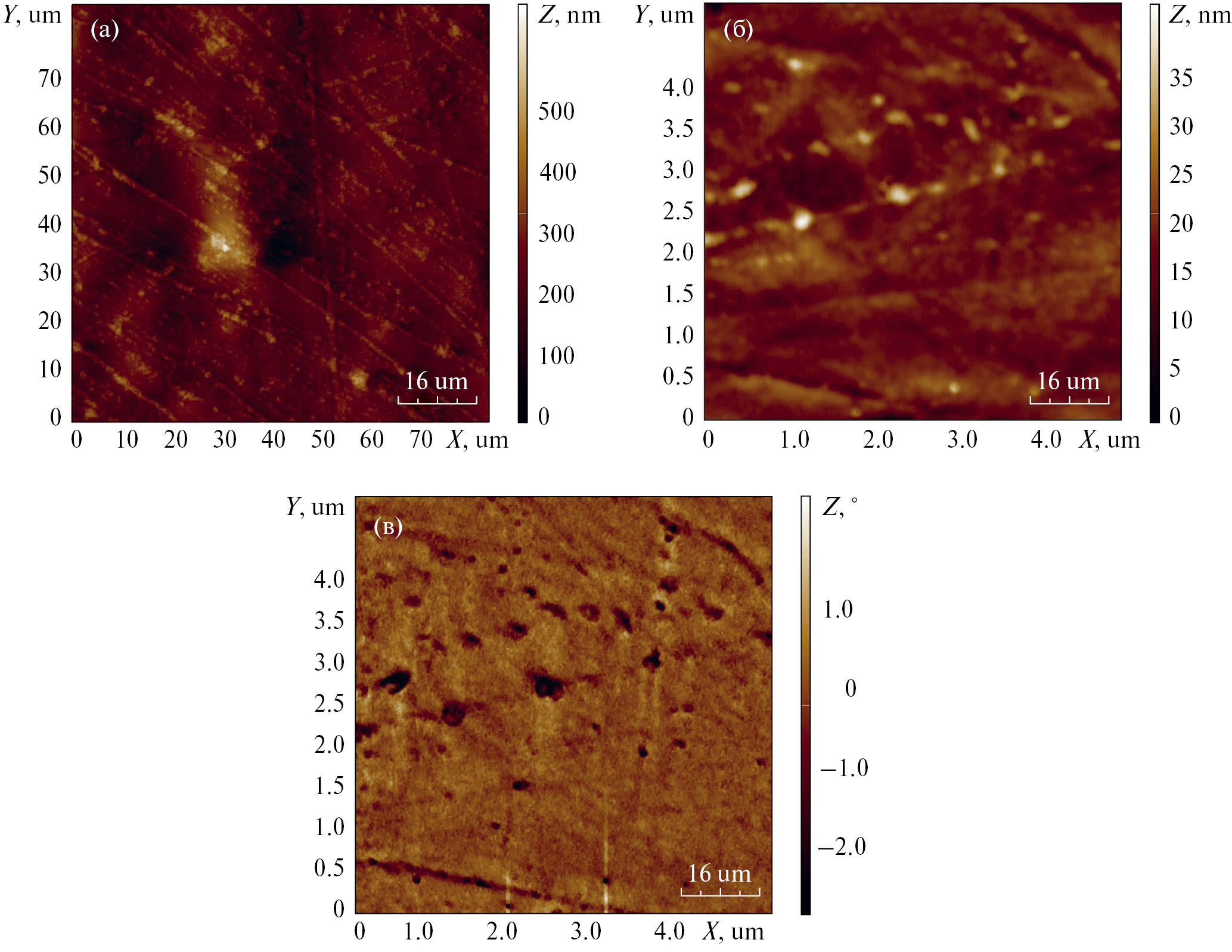 Рис. 2. АСМ-изображения покрытий из ОСК на основе лака КО-921, без ПДМС. а, б) топология; в) фазовый контраст