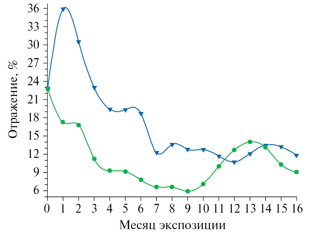 Рис. 6. Изменение блеска ОСП на основе кремнийорганического лака КО-921, модифицированного 17 масс. % ПДМС и 20 масс. % эпоксидной смолы за 16 месяцев экспозиции: ► – в условиях субэкваториального климата, ● – в условиях тропического саванного климата