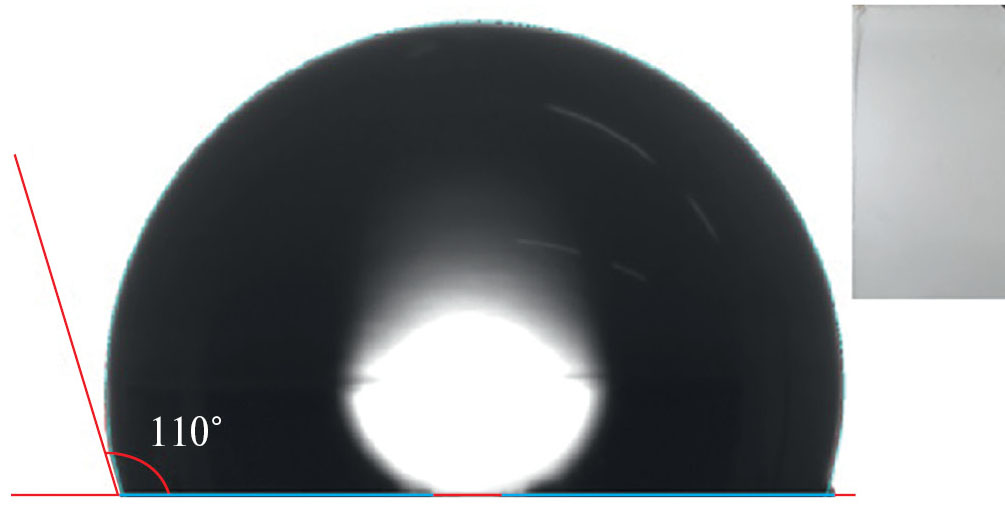 Результаты измерения угла смачивания по истечении 16 месяцев натурных испытаний в Тропцентре на КИС Кон Зо представлены на рис. 9, который иллюстрирует угол смачивания водой θ = 110°. Этот результат позволяет сделать вывод о том, что за время экспозиции в экстремальных условиях тропического саванного и субэкваториального климата, несмотря на ухудшение оптических характеристик и некоторые признаки начала деструкции полимерной матрицы, его гидрофобная поверхность полностью сохранила свои водоотталкивающие свойства.