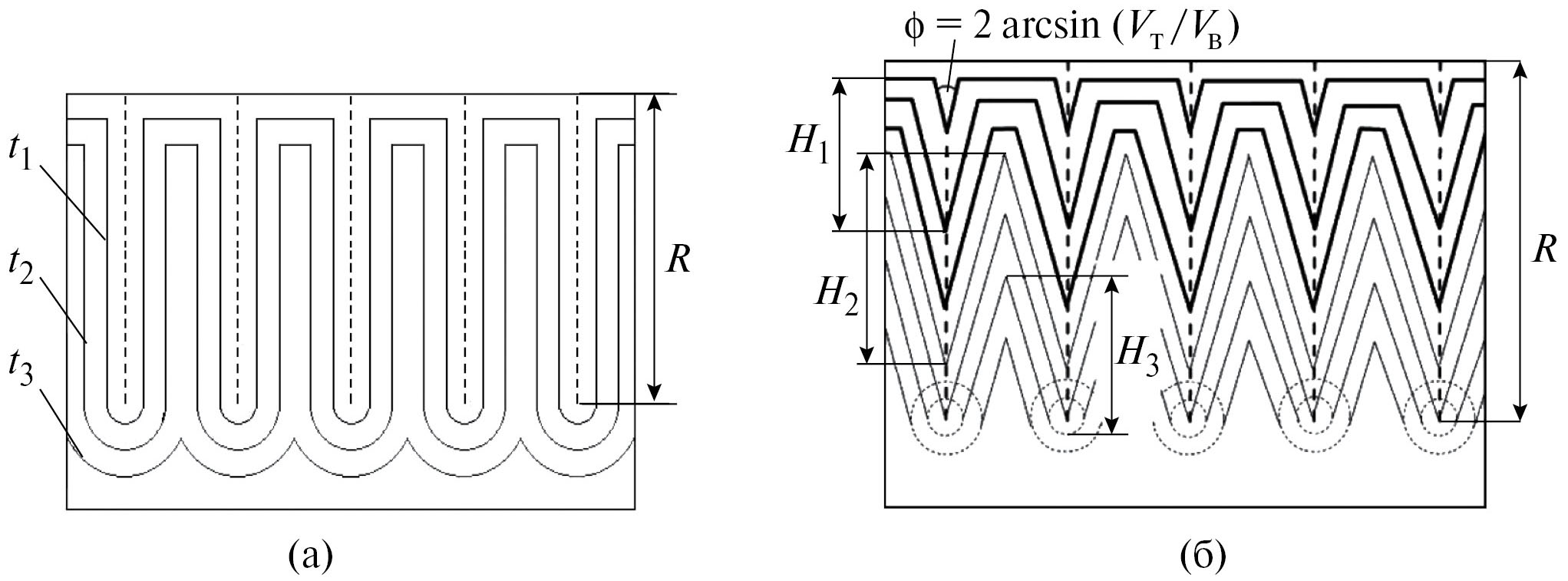 Рис. 2. Формирование шероховатых поверхностей и их постепенная эволюция при травлении перпендикулярного массива треков с высокой (а) и низкой (б) избирательностью травления. Обозначения поясняются в тексте